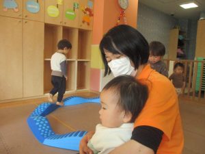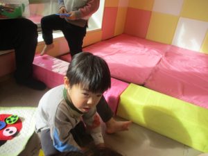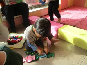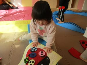 ボタンはめや紐通し等、指先の遊びを楽しんだり、平均台を組み合わせたサーキット遊びを行いました。