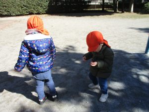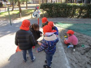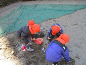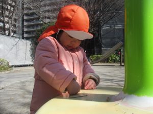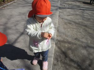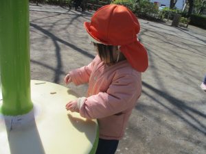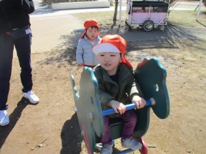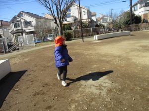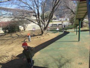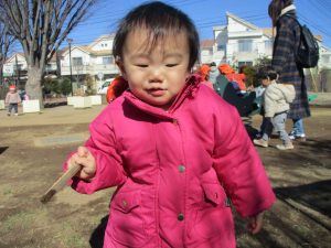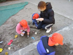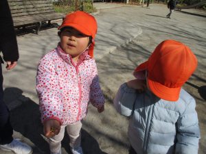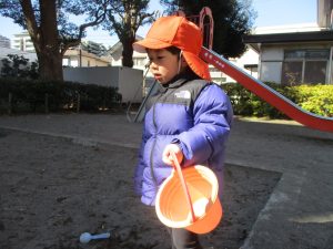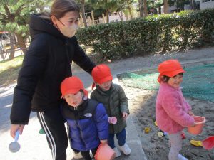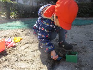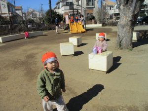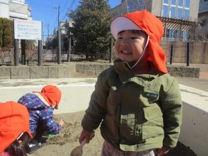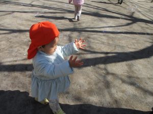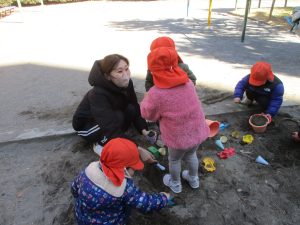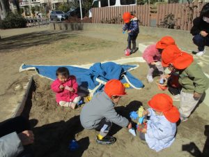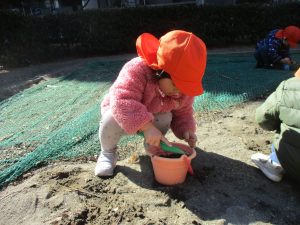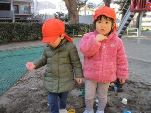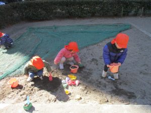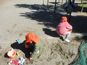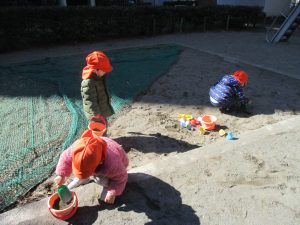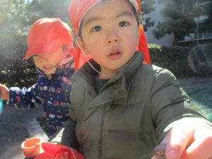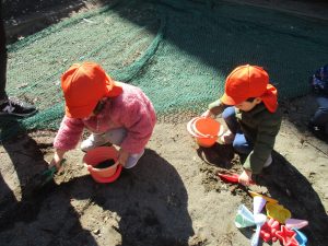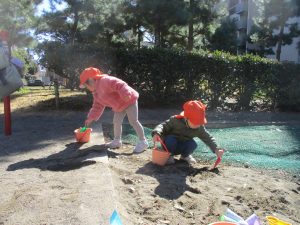 砂場でのままごと遊びを楽しんだり、日向を利用して広場での追いかけっこを通してたくさん体を動かして遊び、大満足の様子でした♪
