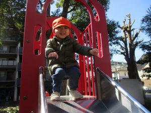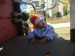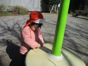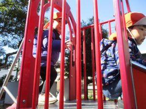 固定遊具で体を動かしたり、遊具近くで木の実や枝を使用して楽しそうにままごと遊びを展開しておりました。美味しいご飯は出来たかな?