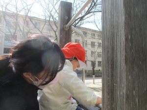固定遊具で体を動かしたり、砂場でのままごと遊びに夢中でした!