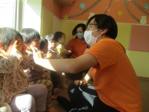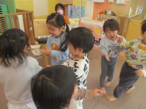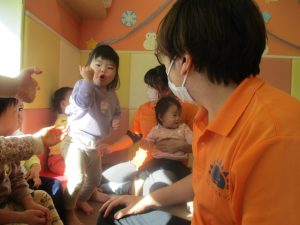 また、ピアノのリズムを聞きわけながら先生たちと一緒に「さーるさーる」、「くま~くま~」、「リスリス!」と動物の名前を言いながら、早い動きや小刻みの動き、ゆっくりの動きなどを楽しんでおります☆
