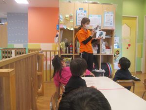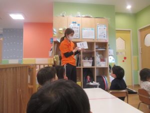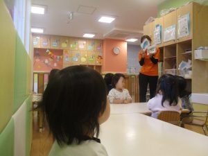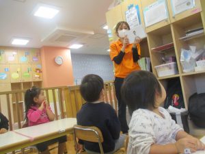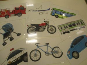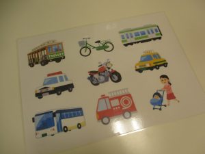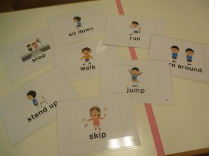 今月は先月に引き続き、「jump(とぶ)」、「stop(とまる)」、「sit down(むきをかえる)」などの動詞を英語で覚えたり、乗り物を英語で覚えたりしております。
