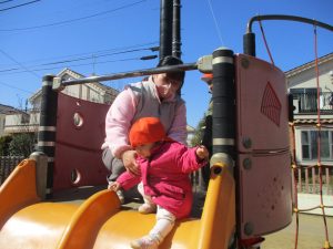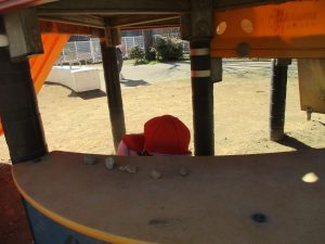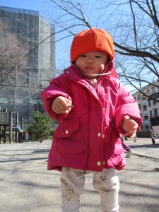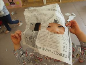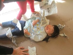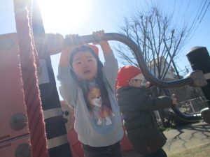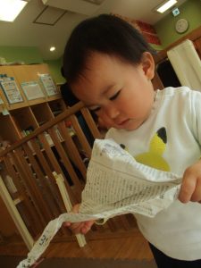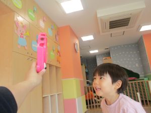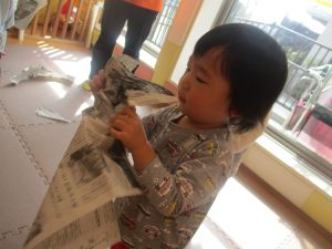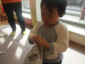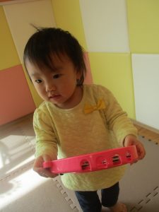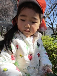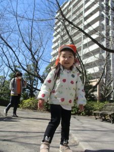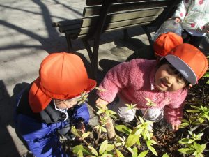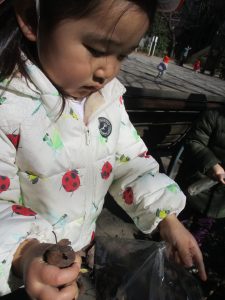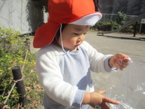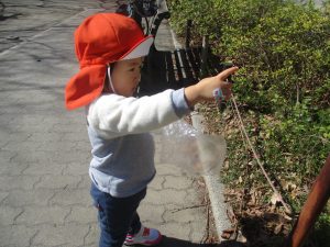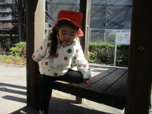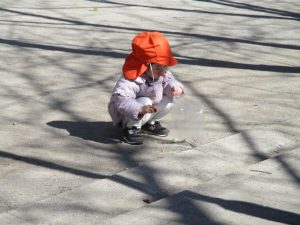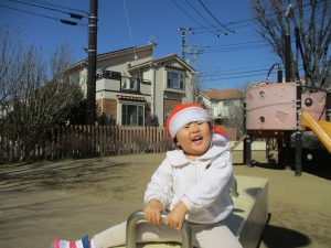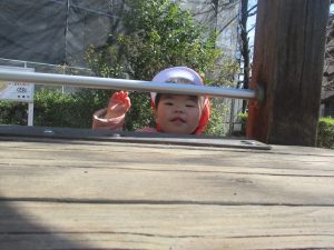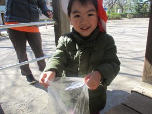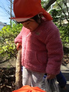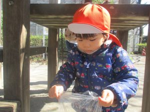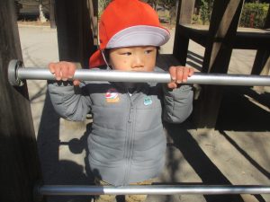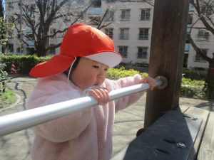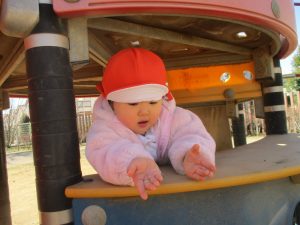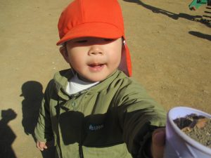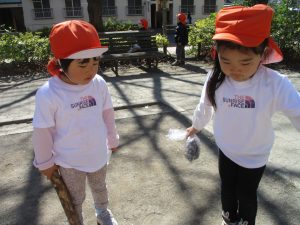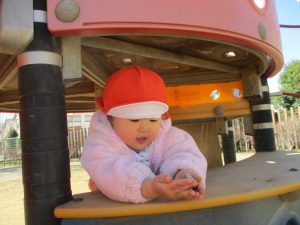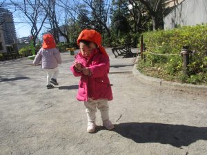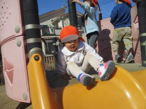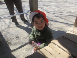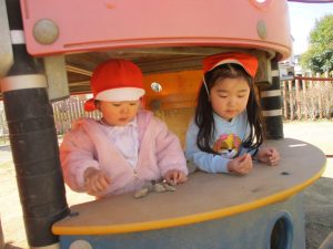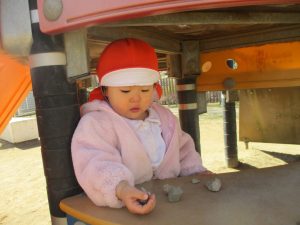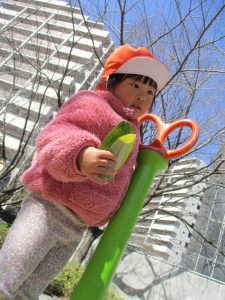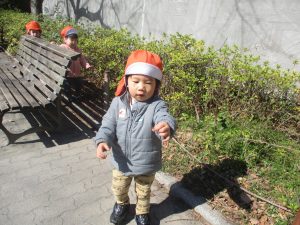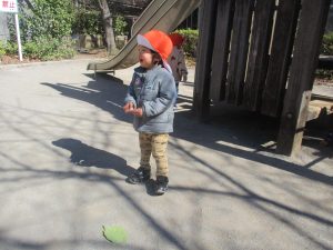 朝方のリトミックを楽しんだ後はさくら公園にて過ごしました。日差しをたっぷりと浴びながら固定遊具で体を動かしたり、木の実や葉っぱ等自然物探しに夢中でした!