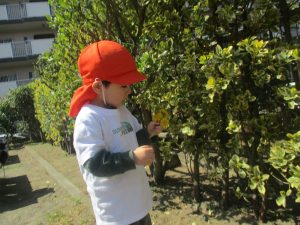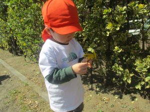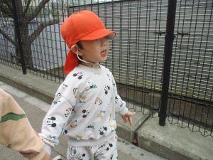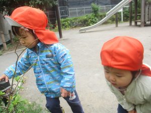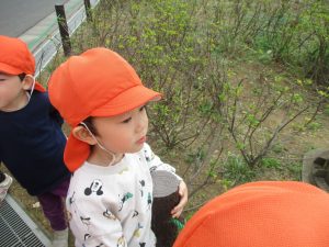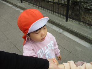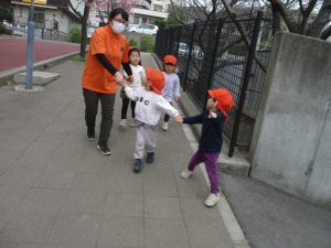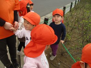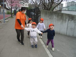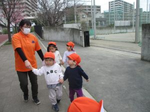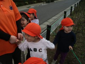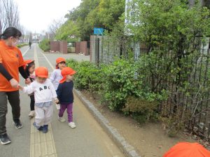 2歳児クラスのお友達は卒園式の練習後、園周辺の戸外散歩へでかけました。