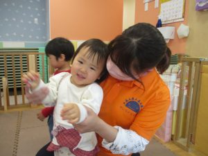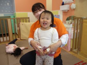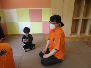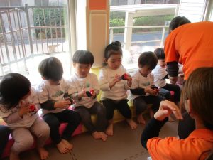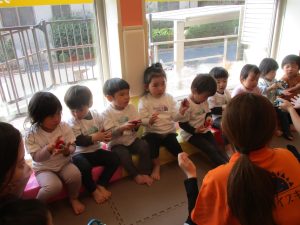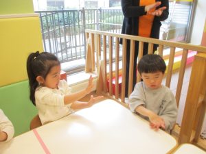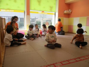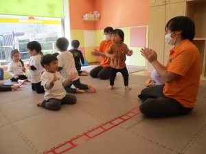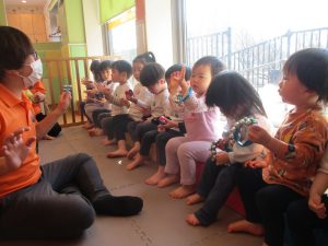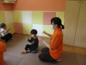 今月は、先生たちと目と目を合わせてスキンシップやアイコンタクトをとりながら鈴やカスタネットを使った楽器遊びも楽しんでおります☆