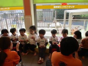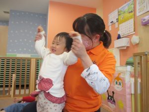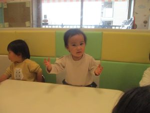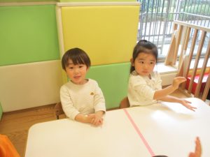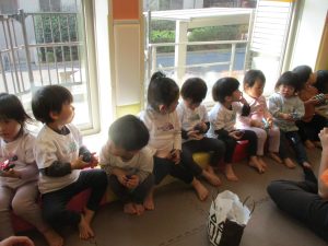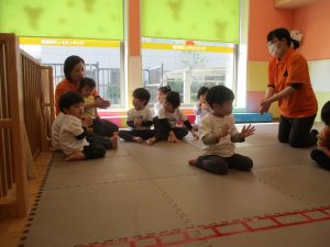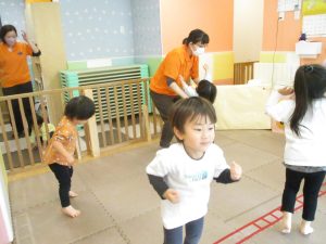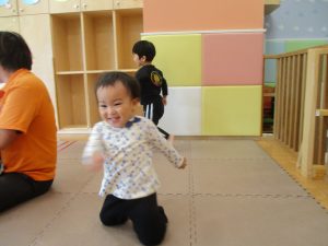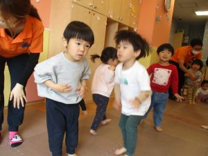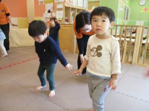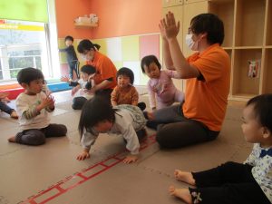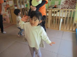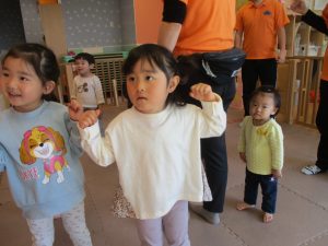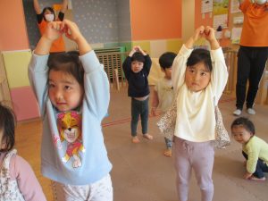 どうぶつたいそうでは、「前に~」と前進するところでお友達とお顔を合わせて「こんにちは~♪」と挨拶を交わす姿も見られてとても微笑ましい姿でした♡