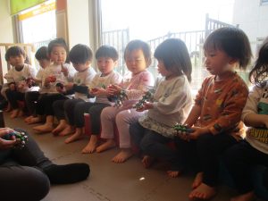 先生の「ひとつ、ふたつ、みっつ、よっつ!」という合図を聞いて楽器の音を鳴らす回数も調節できるようになってきました♪