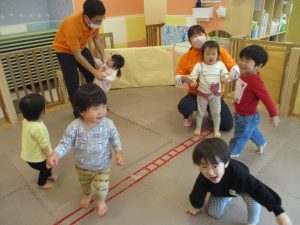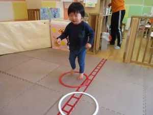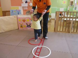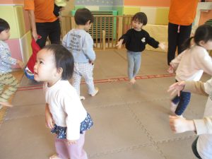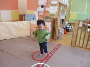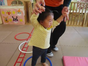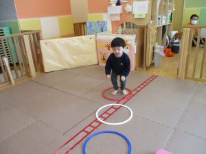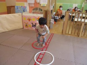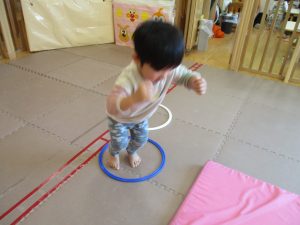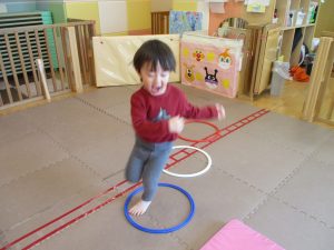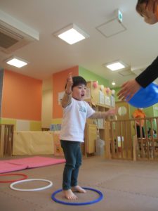 サーキット遊びでは、2歳児クラスのお兄さんお姉さんを真似して、1歳児クラスのお友達もフープからフープへのジャンプに挑戦してみたり、風船飛ばしを楽しんだりしておりました。