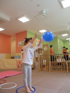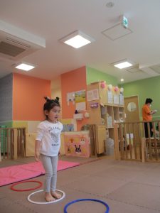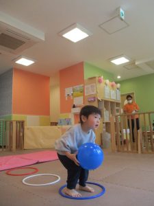 今月は、フープや風船を使ったサーキット遊びや、「どうぶつたいそう1・2・3」と「モリモリマッチョ!!」の体操を行っております。
