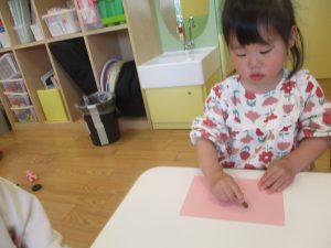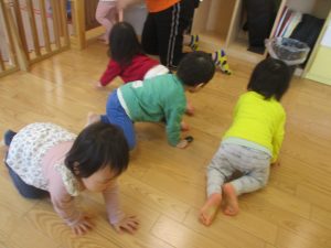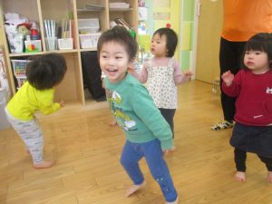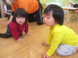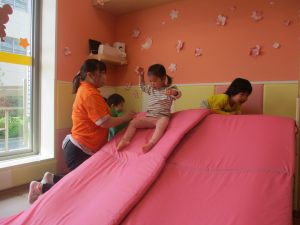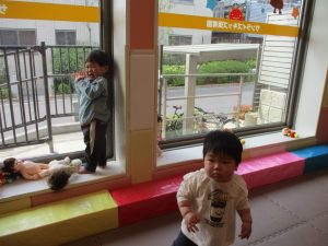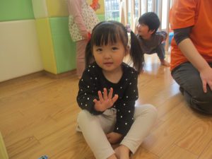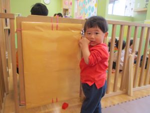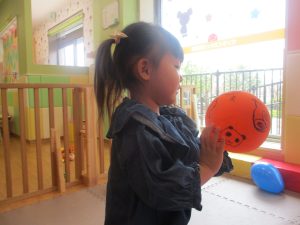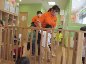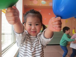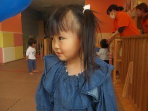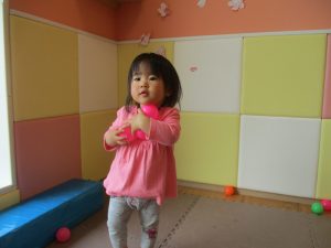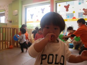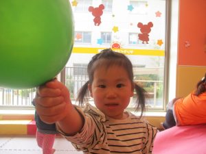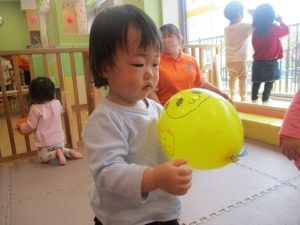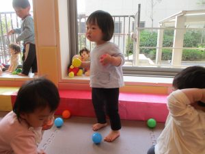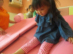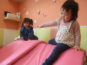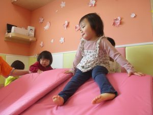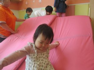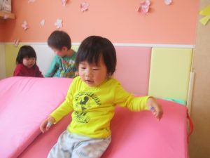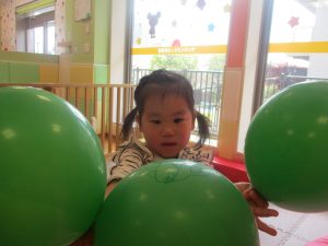 2歳児クラスのお友達は室内にてコットすべり台や風船を使用して、思い切り体を動かして過ごしました。明日には戸外活動がスタート出来るかな?