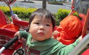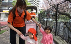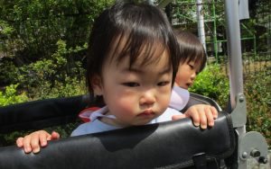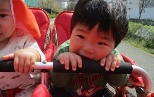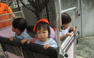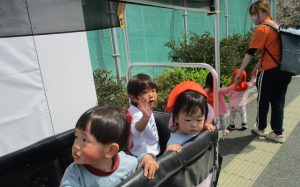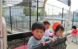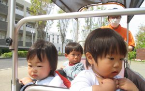 1歳児クラスのお友達は戸外遊びデビュー致しました。園周辺の戸外散歩となりましたが、散歩カートの中から桜の散る様子や道行く車やバスをじーっと見つめておりました!