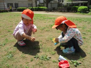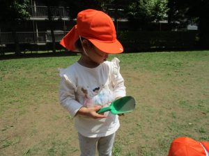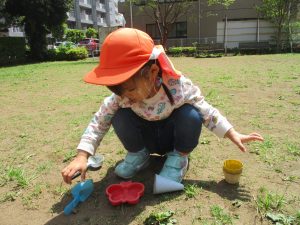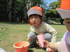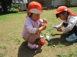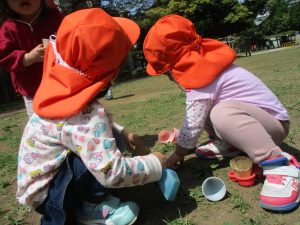 2歳児クラスのお友達は1号公園にて過ごし、砂場セットを使用してままごと遊びを楽しそうに展開しておりました!