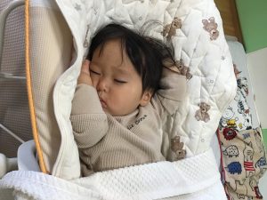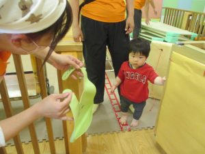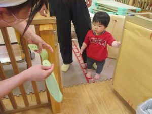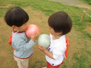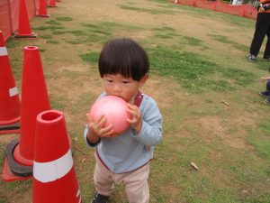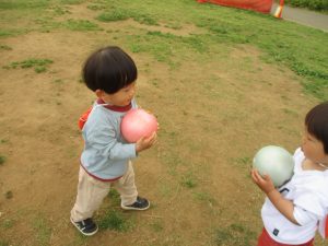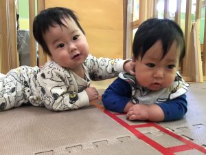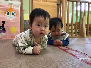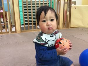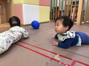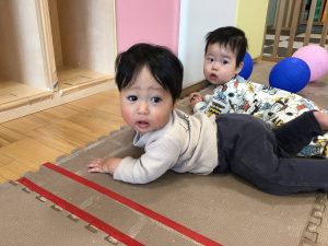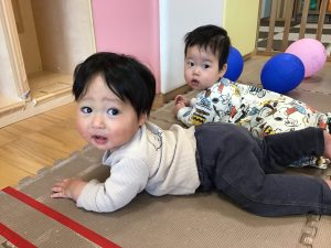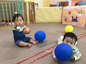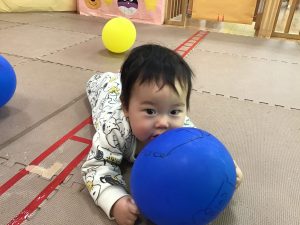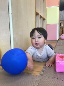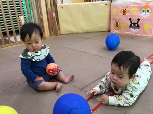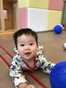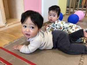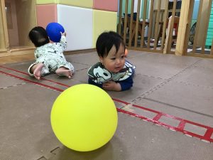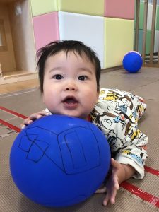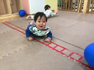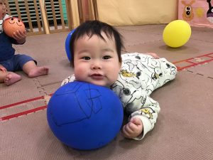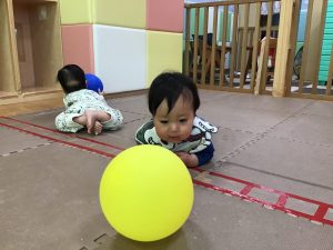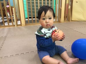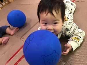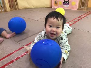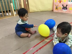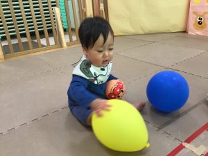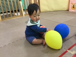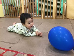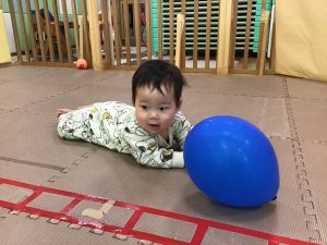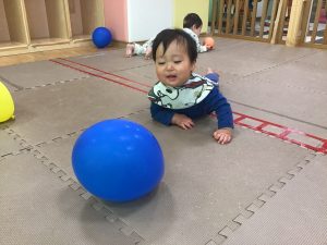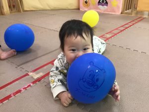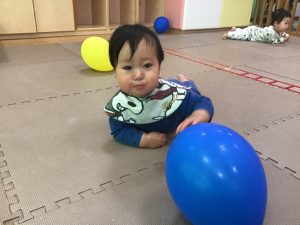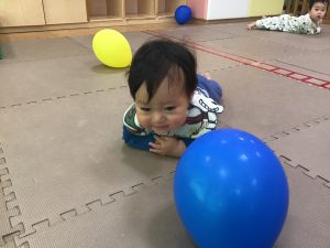 0歳児クラスのお友達は室内にて過ごし風船をハイハイで追いかけたり、お気に入りの風船を見つけては大事そうに抱えておりました♪