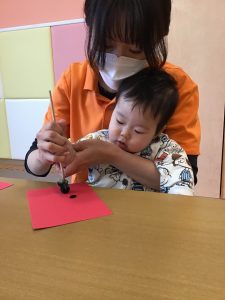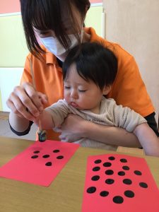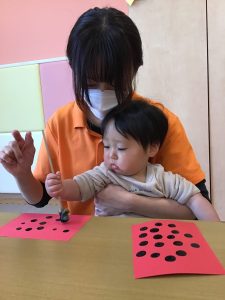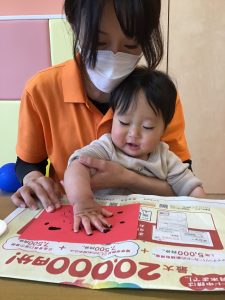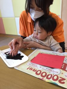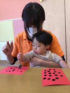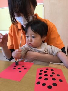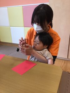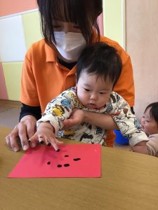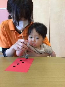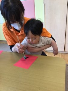 先生と一緒に手形や絵の具スタンプを行い、不思議な表情を見せる中にも満足げな様子でした。