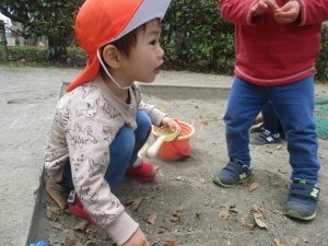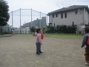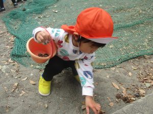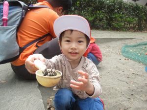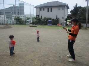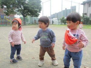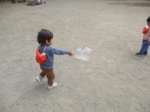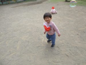 シャボン玉を楽しそうに追いかけてはたくさん体を動かしたり、木の枝や葉と言った自然物を拾い集めてはベンチにならべ、楽しそうにままごと遊びを展開しておりました!