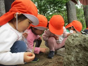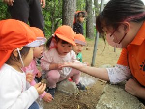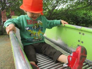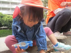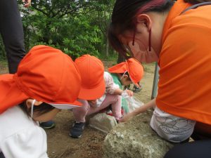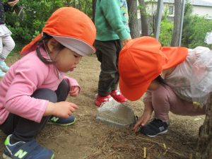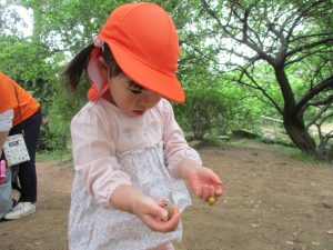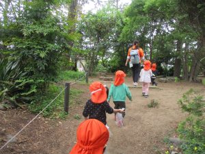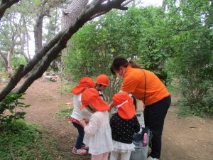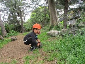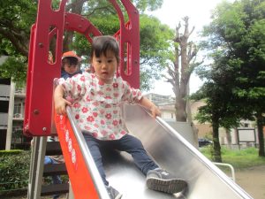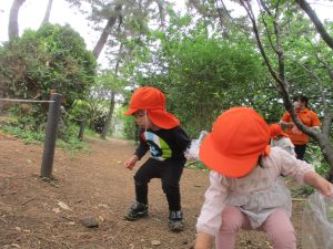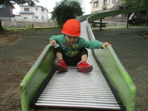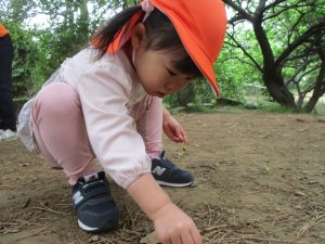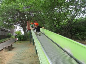 2歳児クラスのお友達は谷津コミュにて過ごし、ローラー滑り台で体を動かして遊んだり奥の林にて自然物探しを楽しみました。