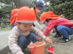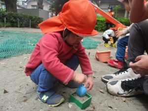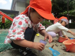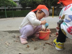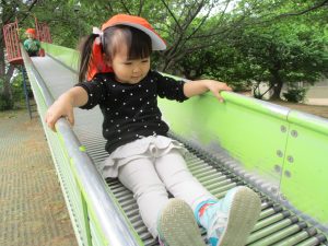砂場セットを使用してままごと遊びを楽しそうに展開したり、すべり台を使用してたくさん体を動かして遊んでおりました。