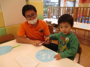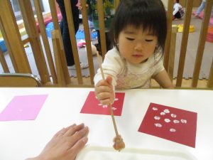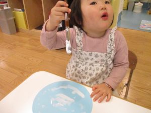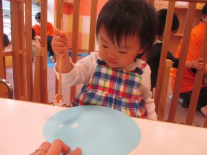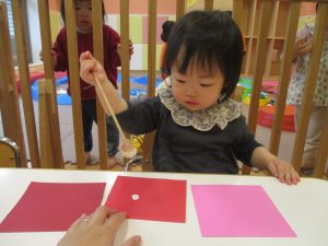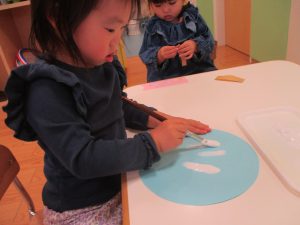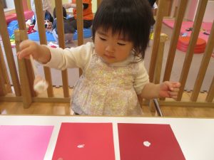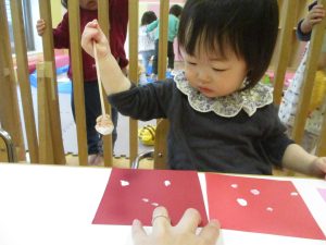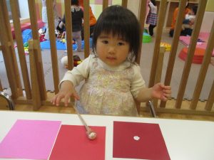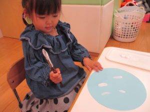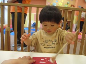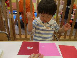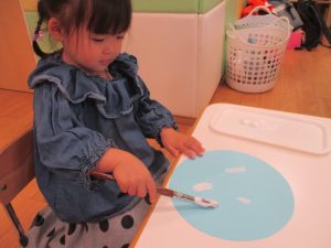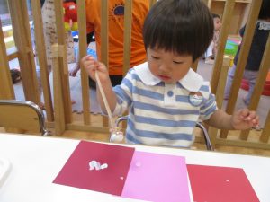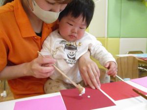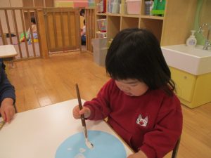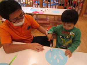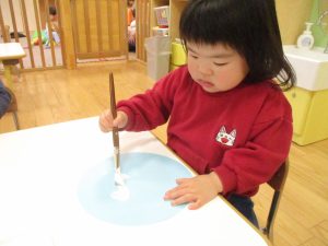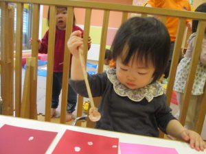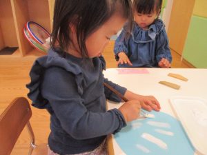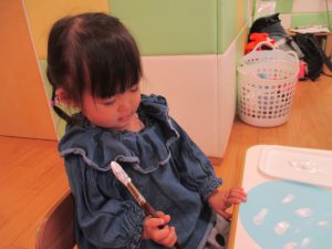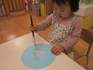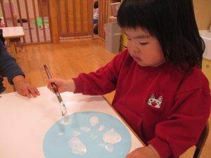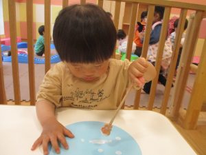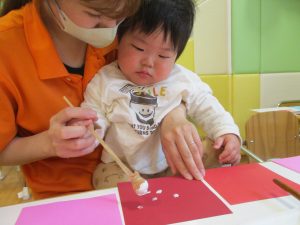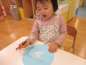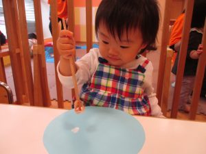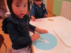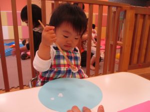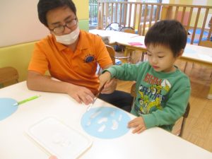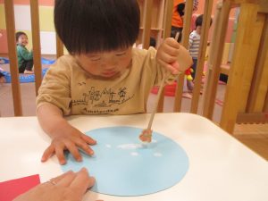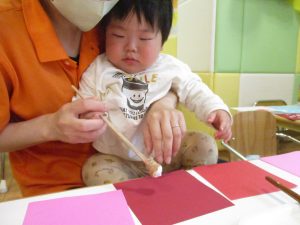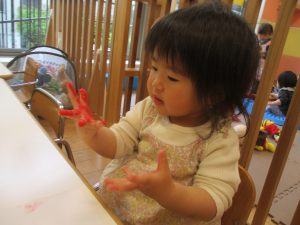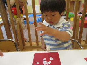 手形やスタンプや筆を使用して、思い思いの絵の具遊びを楽しんでおり完成が待ちどおしいです!