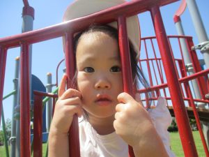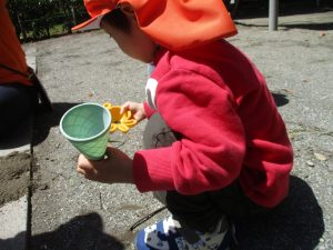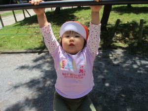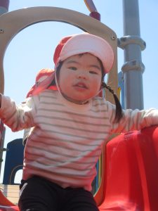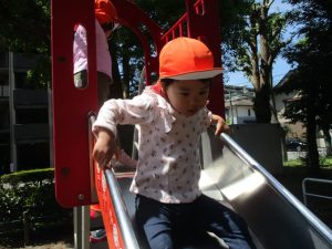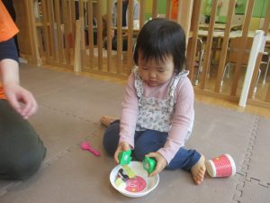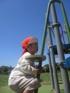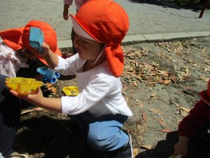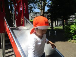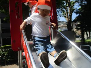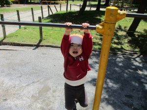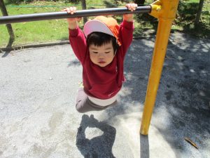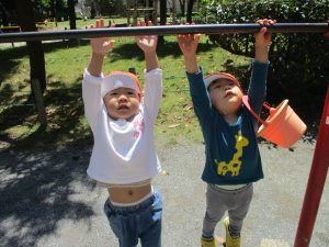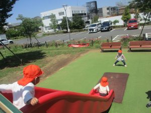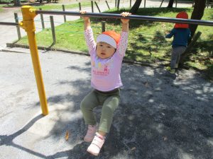 すべり台や鉄棒のぶら下がりを通して存分に体を動かして遊んだり、砂場セットを使用して砂場でのままごと遊びも行いました。