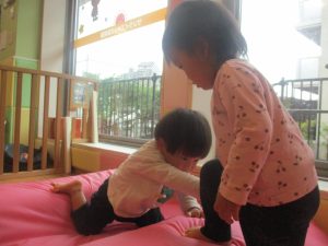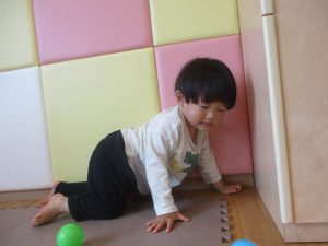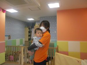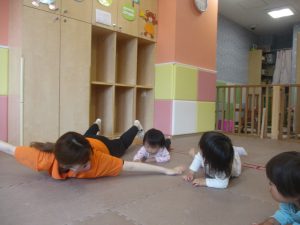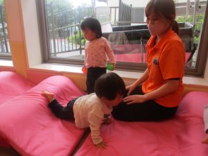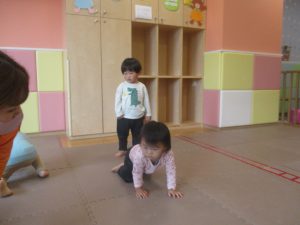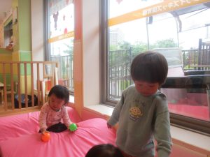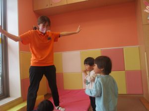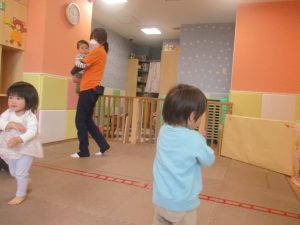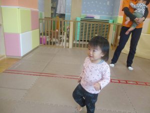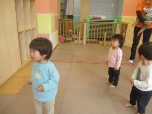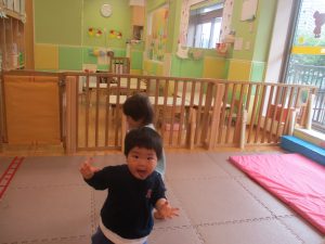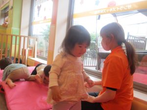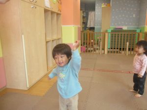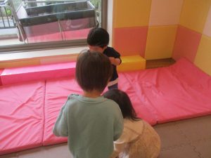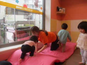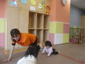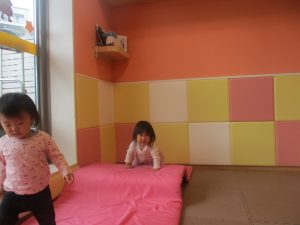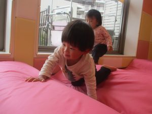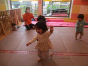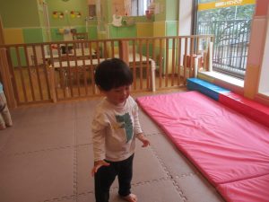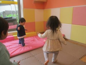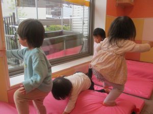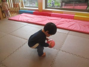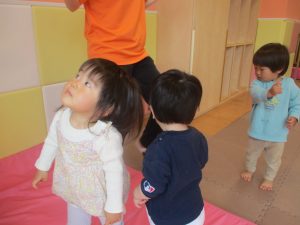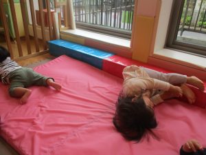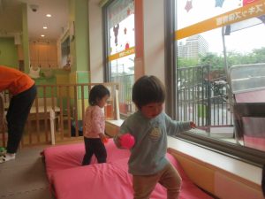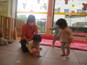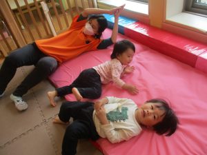 0.1歳児クラスのお友達は室内にて過ごし、マットやボールを使用して思い切り体を動かして遊んだり、リズム体操を楽しみました。