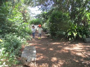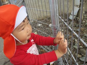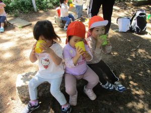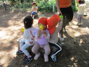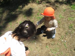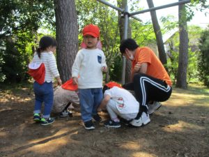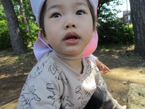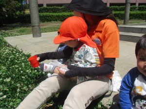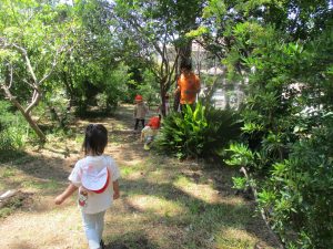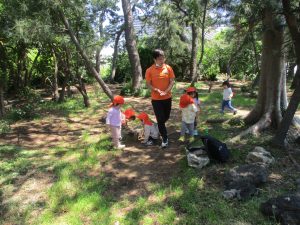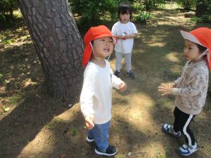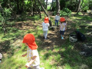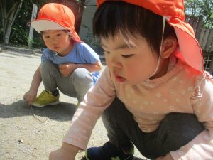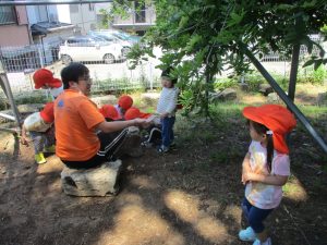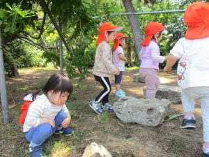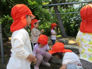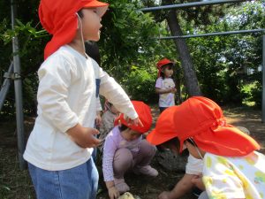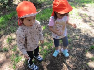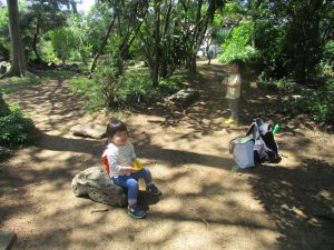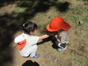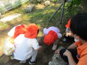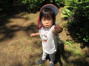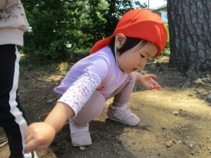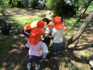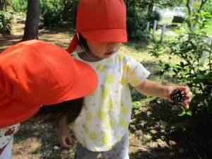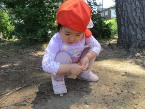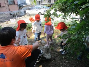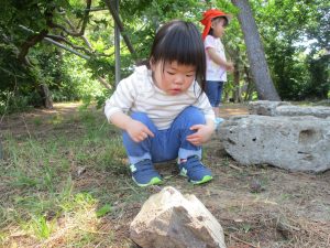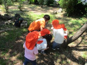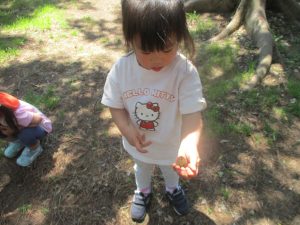 毎年2歳児クラスのお友達はここが大好きなようで、お気に入りの木の実や石の裏側にいる虫を先生と一緒に探しておりました。
