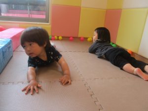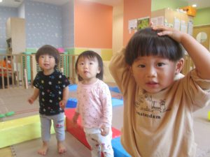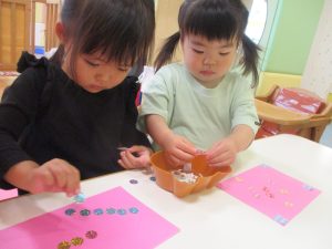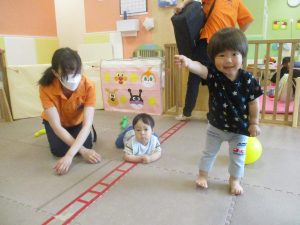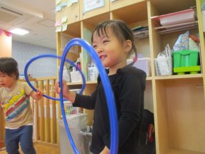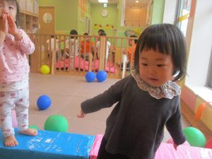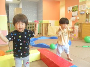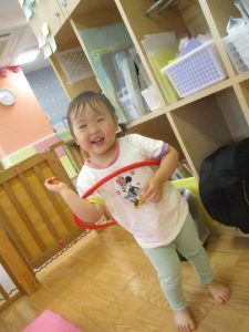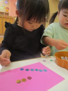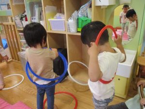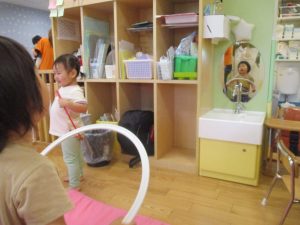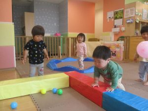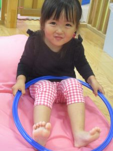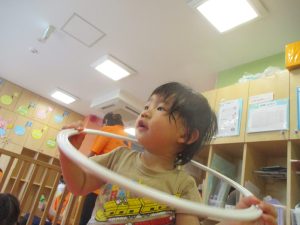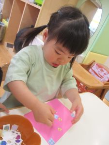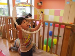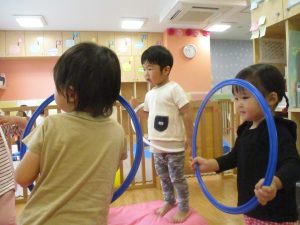 2歳児クラスのお友達はシール貼りを楽しんだり、フラフープや平均台を使用して体を動かして遊びました!
