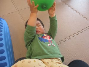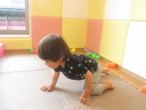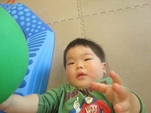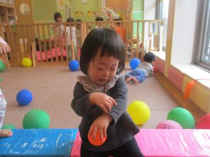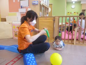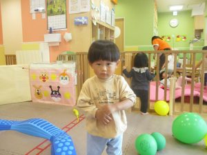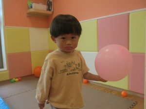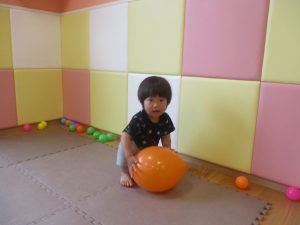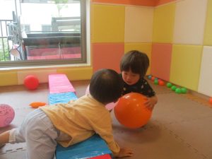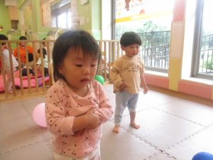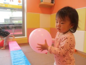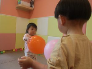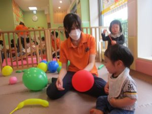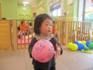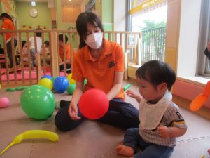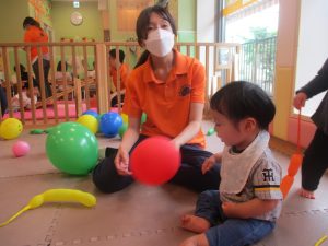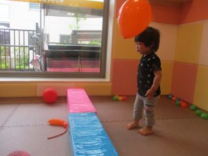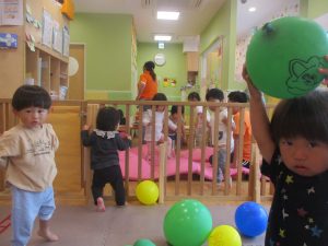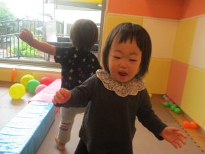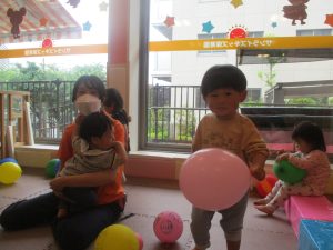 0.1歳児クラスのお友達はボールプールや風船を使用して思い切り体を動かして遊びました。