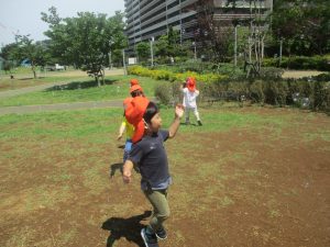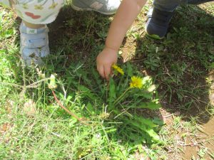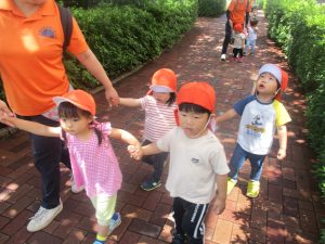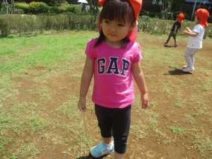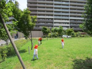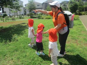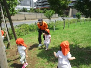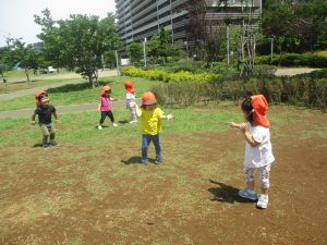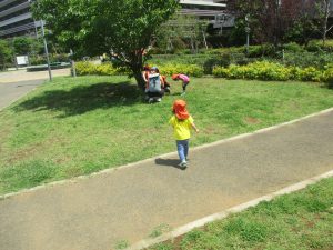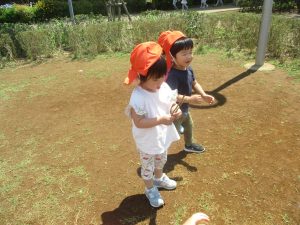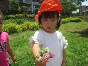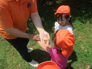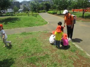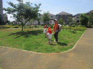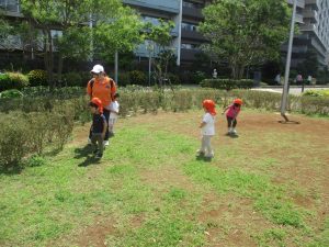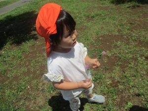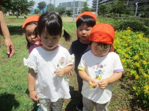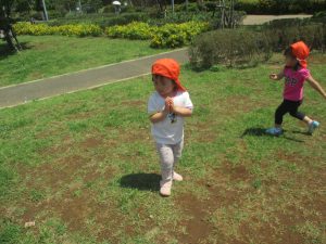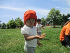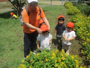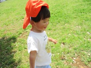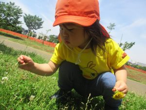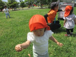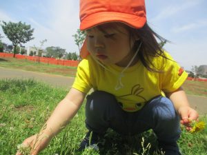 小さいクラスのお子様達は広々とした広場で先生と一緒に「まてまて~♪」を追いかけっこを楽しんだり、草花採集をしたりしておりました。