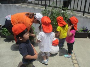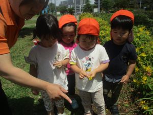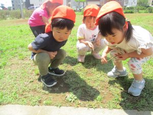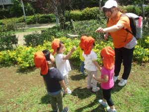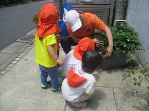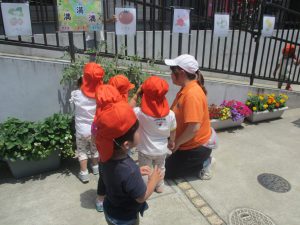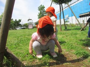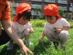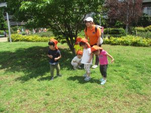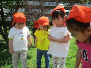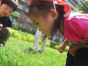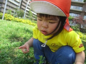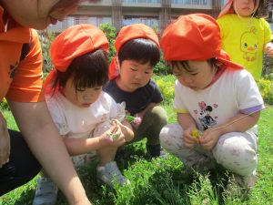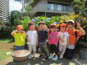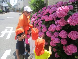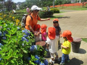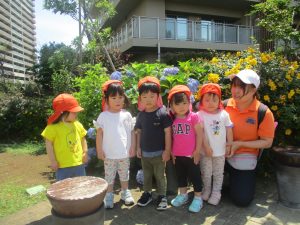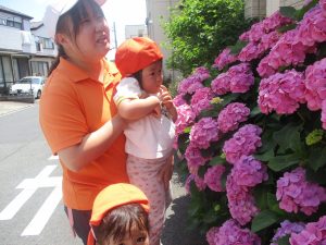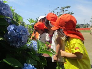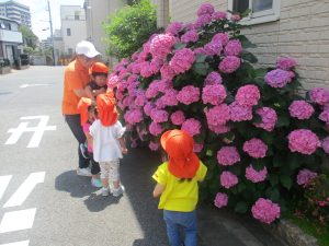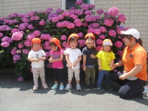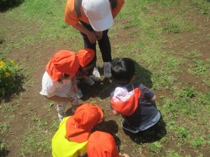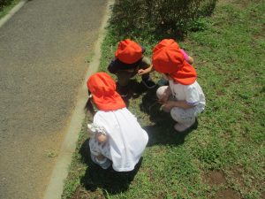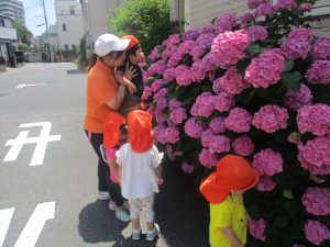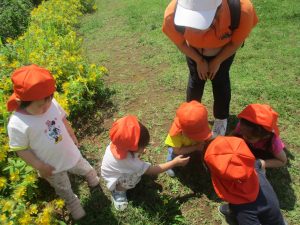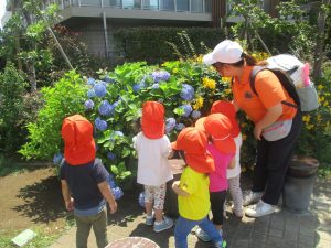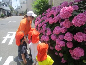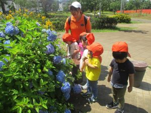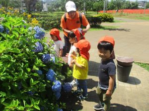 先生と一緒にアジサイやタンポポのお花、この時期に綺麗に咲いている黄色いお花を観察したり、地面をじっくりと眺め虫さんを発見したりして楽しんでおりました。
