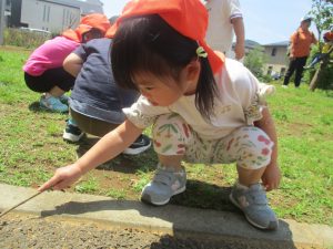 雨上がりの道端にはダンゴムシさんたちもおでかけをしており「わ!ダンゴムシいっぱい!アリさんもいるかなー?」と目をキラキラとさせるお子様達でした☆