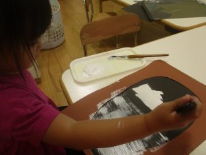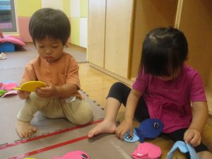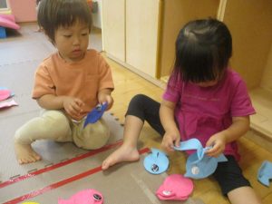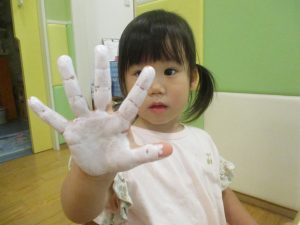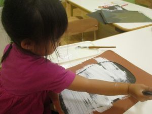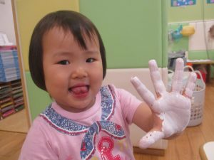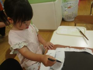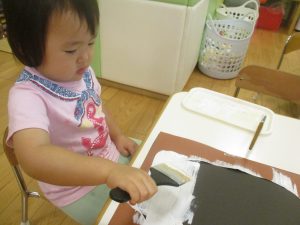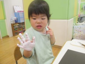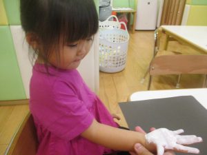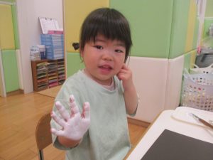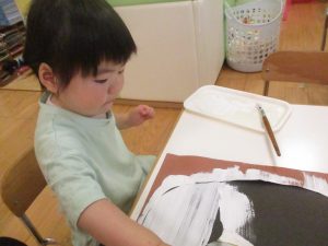 2歳児クラスのお友達は絵の具を使った製作遊びも行いました。