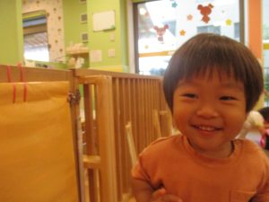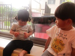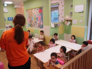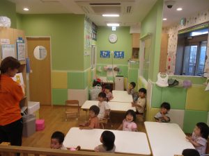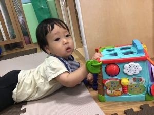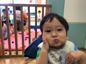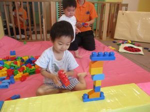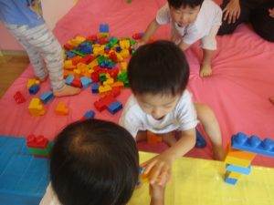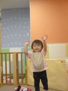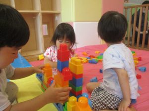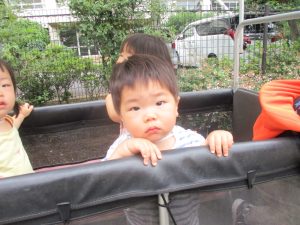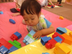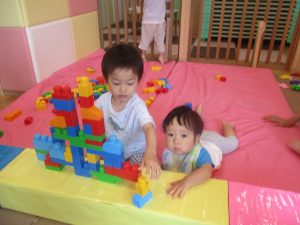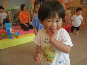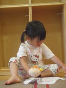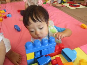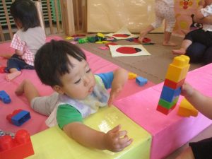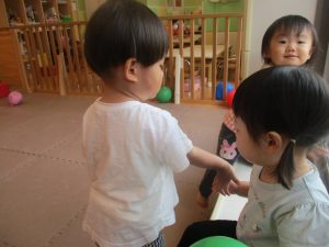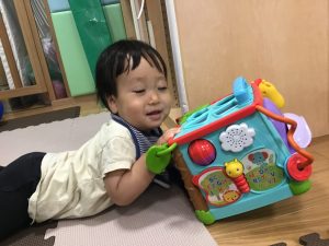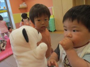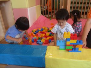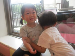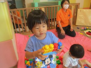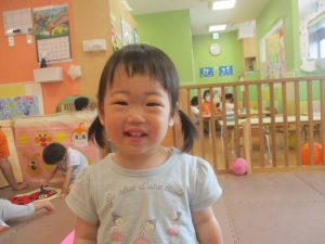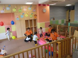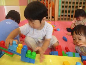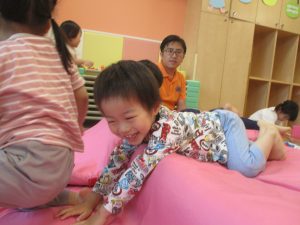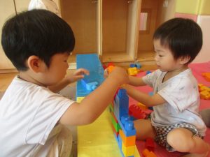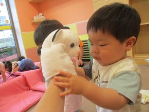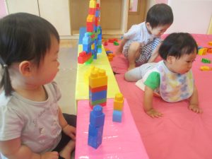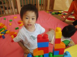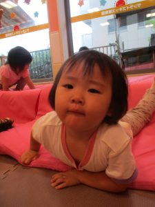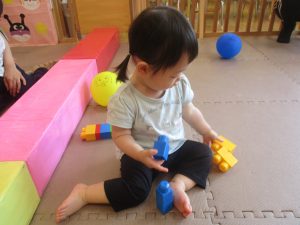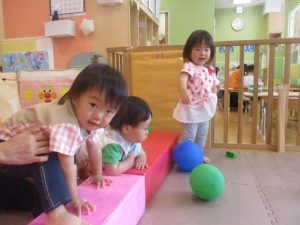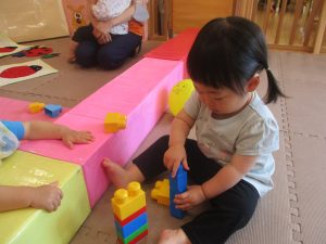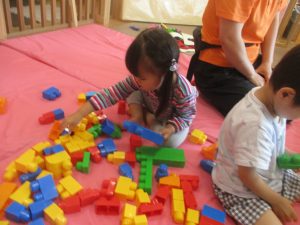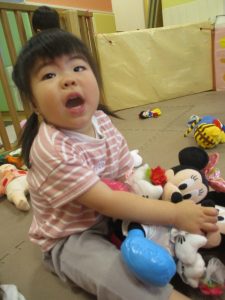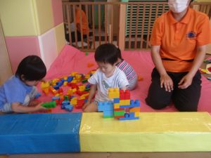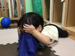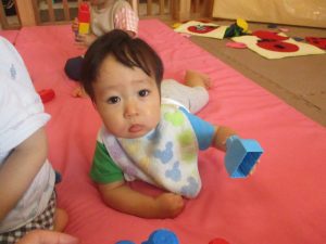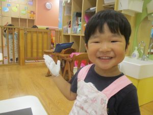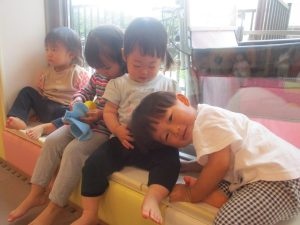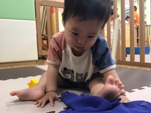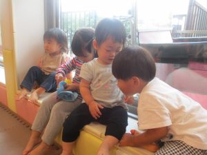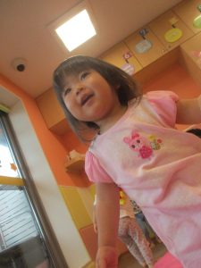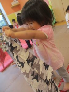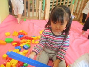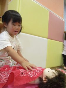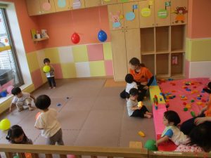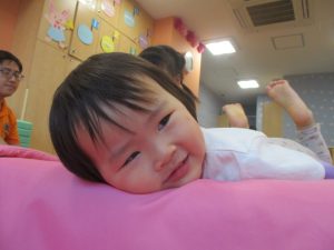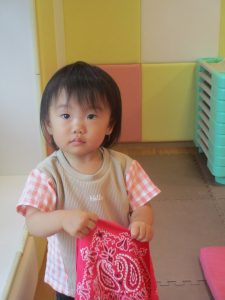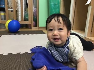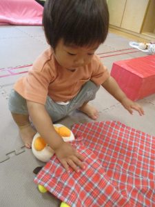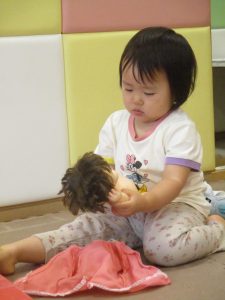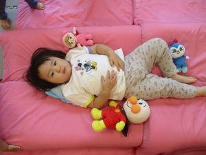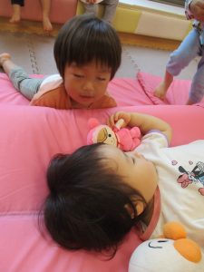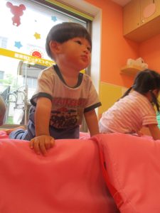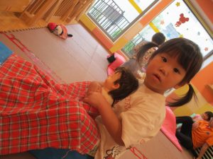 日中は室内にて過ごしましたがマットすべり台で体を動かしたり、人形や風呂敷を使用してままごと遊びを楽しそうに展開しておりました。