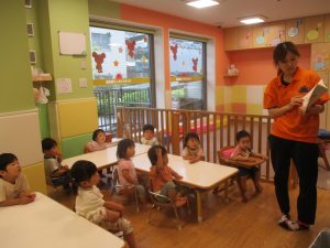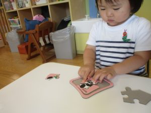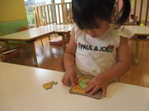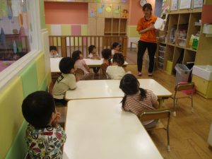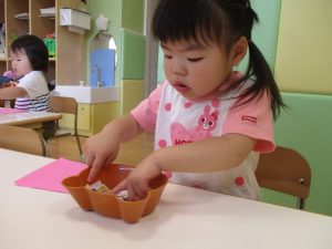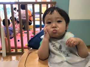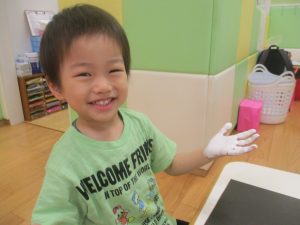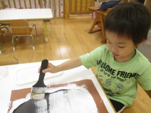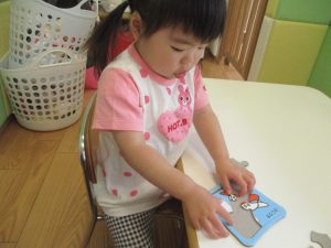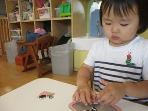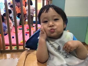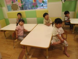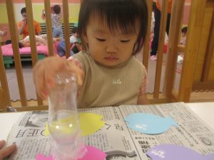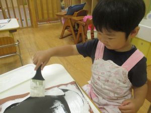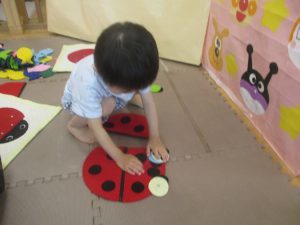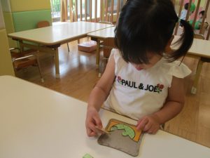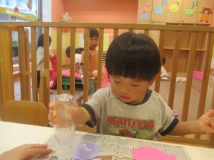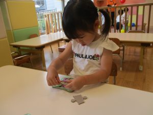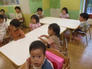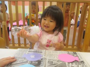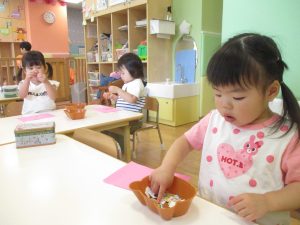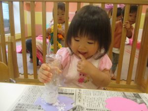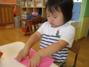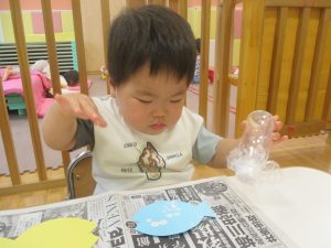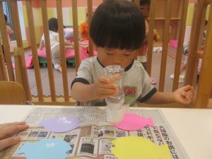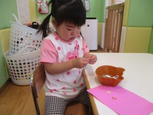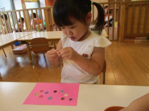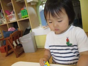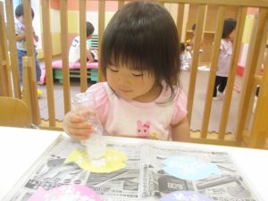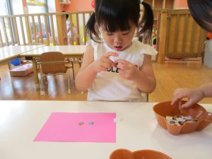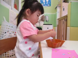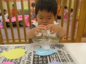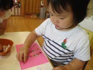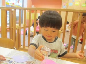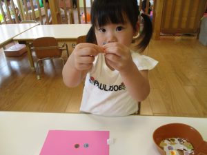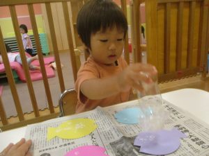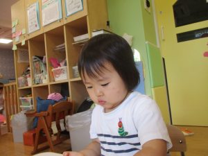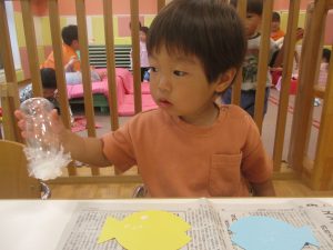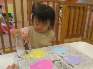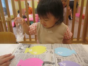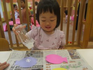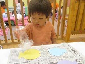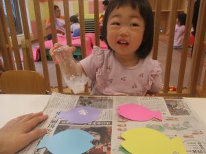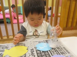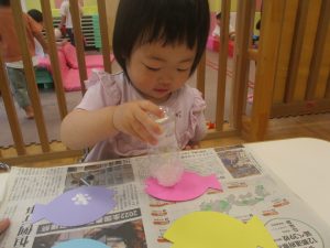 1歳児クラスのお友達は夏の製作も楽しんでおります♪可愛いお魚さんが出来上がりそうです。