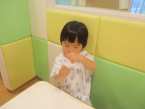 今月のリトミックでは、①「手をたたきましょう」や「しずかなこはんの」と言う歌に合わせて「1、2、1、2」と先生たちと一緒に拍を感じる遊びに取り組んでおります。曲のテンポを変えて「スピードアップ!」や「スローダウン…」も楽しんでおります。