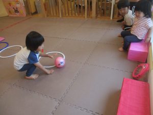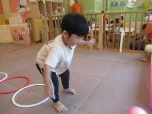 今月の体操では、バランス片足やボール蹴りにも挑戦しております。
