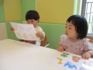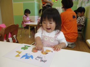 今月の英語では、動物の英単語をフラッシュカードを使って覚えたり、ラミネートカードを使って探すゲームをしたりする活動をしております。