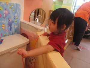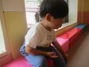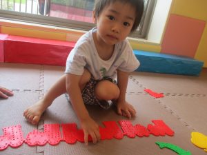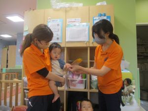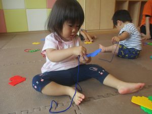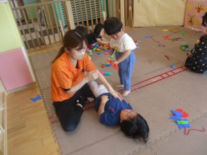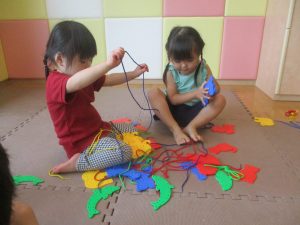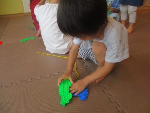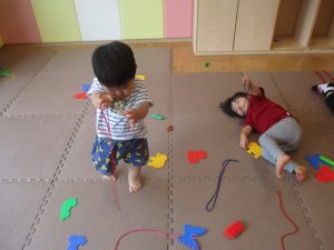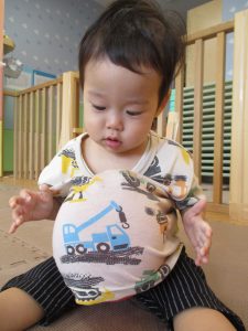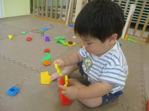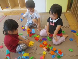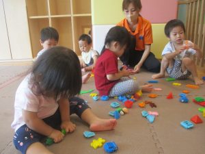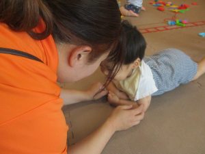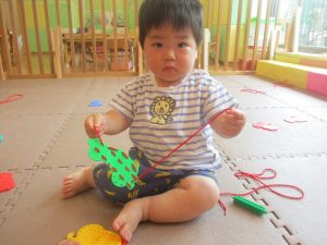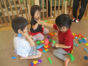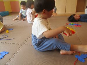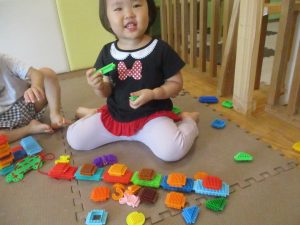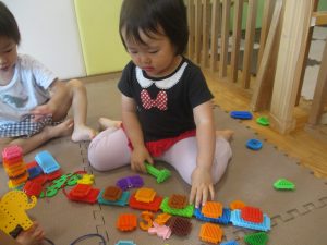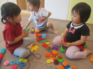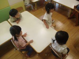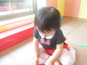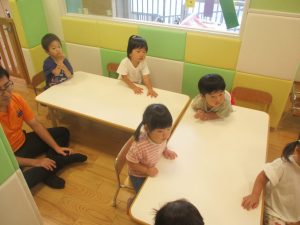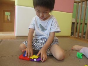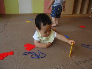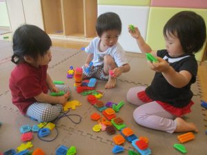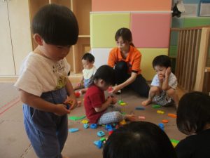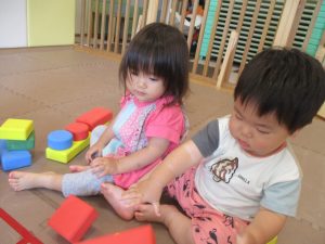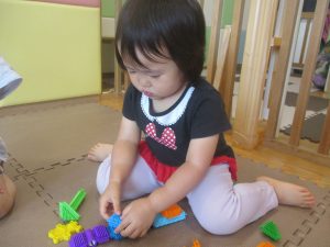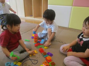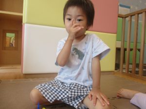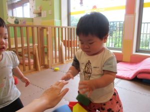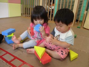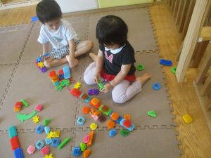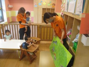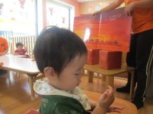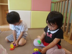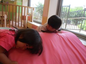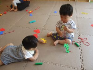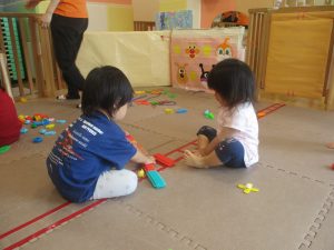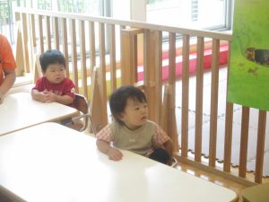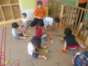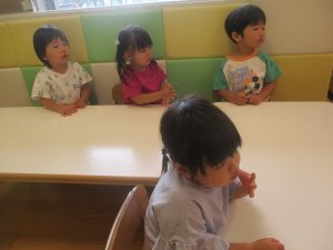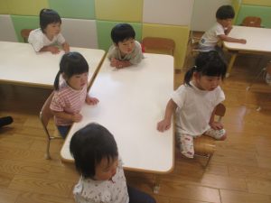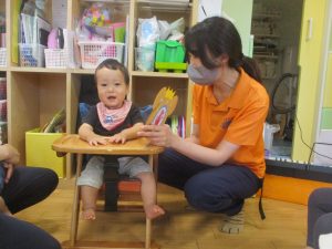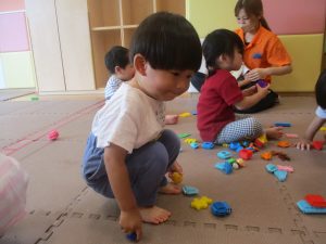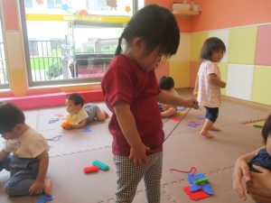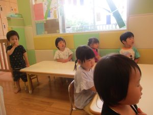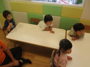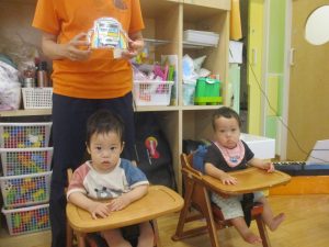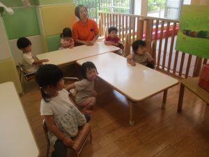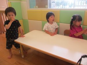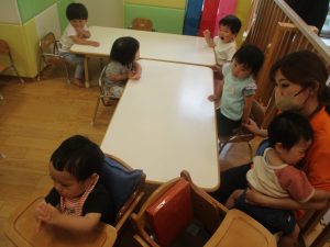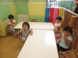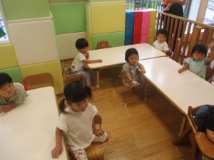 0.1歳児クラスのお友達は暑さを考慮し、室内にて過ごしました。