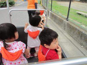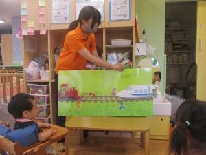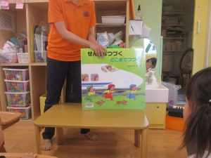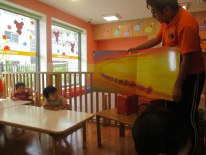 同シリーズの絵本は園内にあるのですが、少しストーリーが違っておりまた大きな絵本にしか出せない大迫力に、乗り物大好きな谷津園のお子様達は目が釘付けでした!