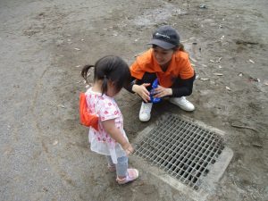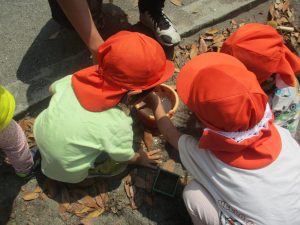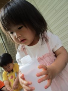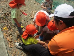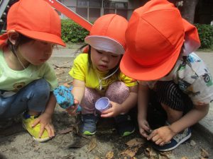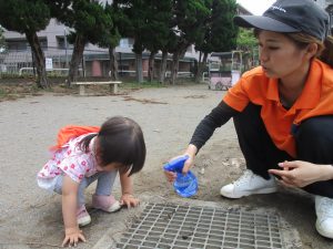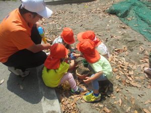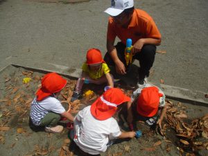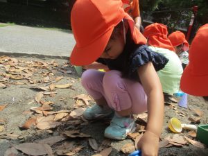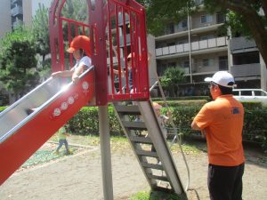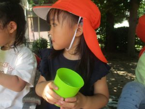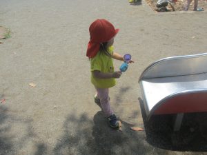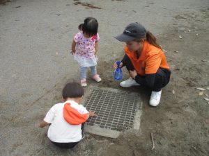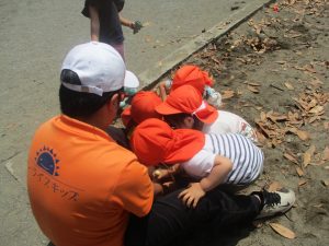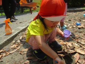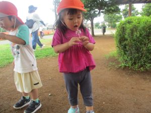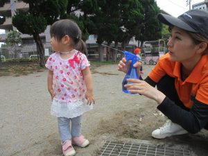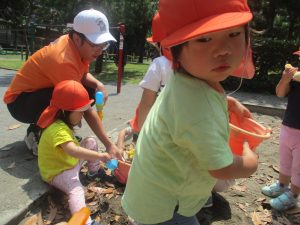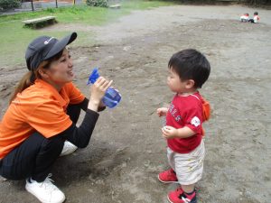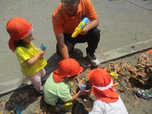 公園内を散策したり、先生と一緒に霧吹きを使用して「プチ水遊び」も楽しみました。