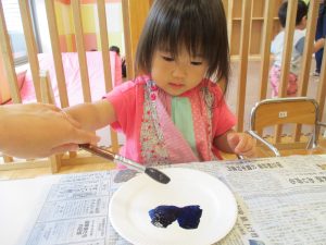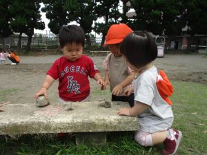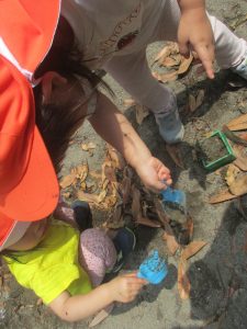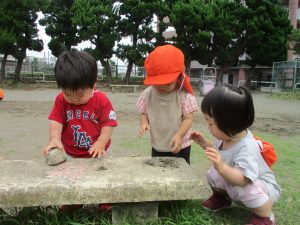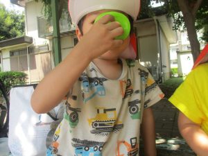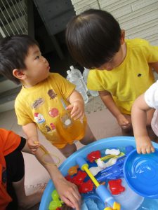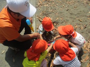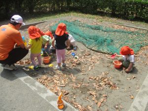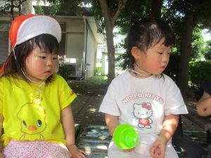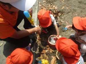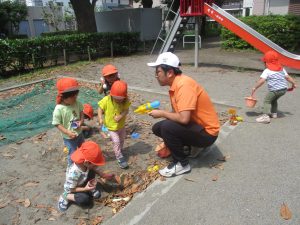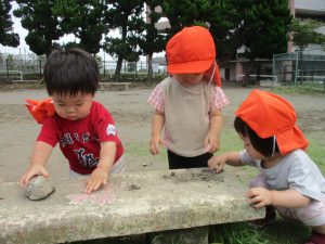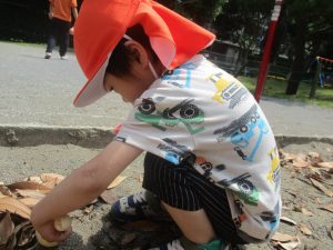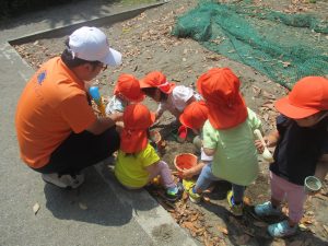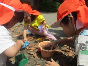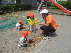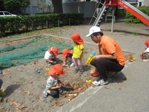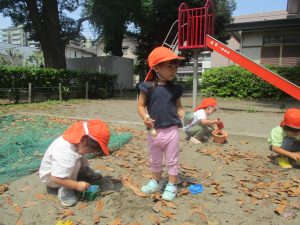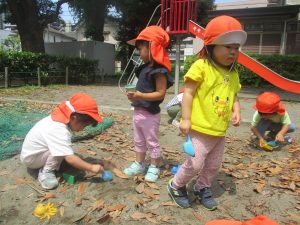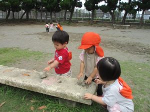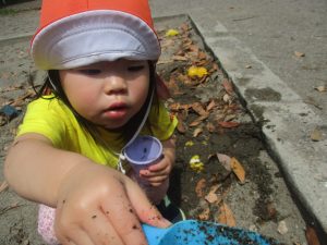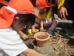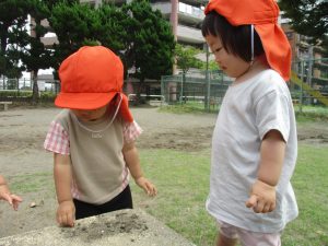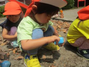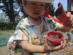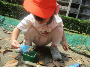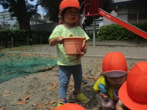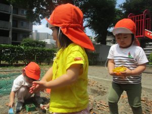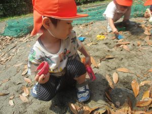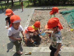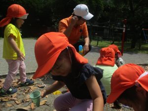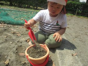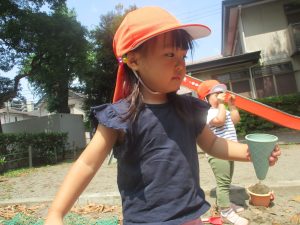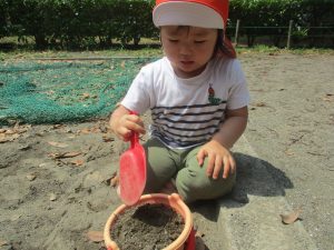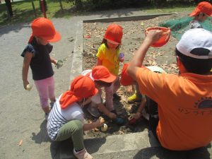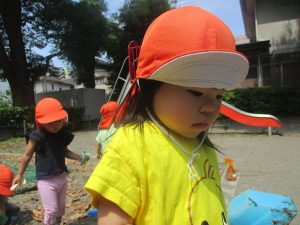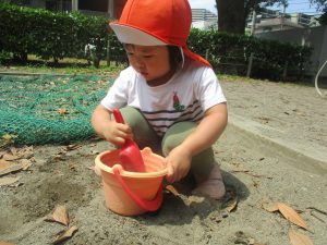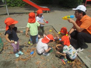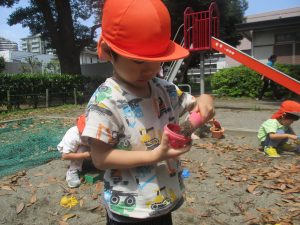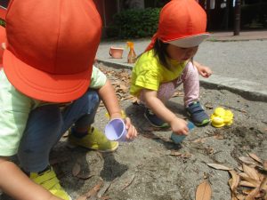暑さに負けず砂場でのままごと遊びに夢中でした。