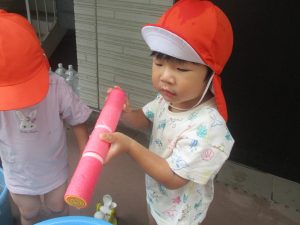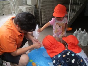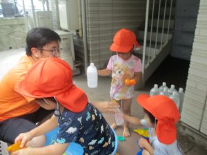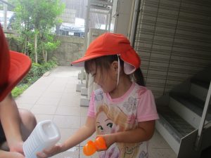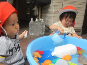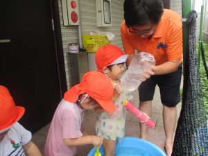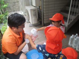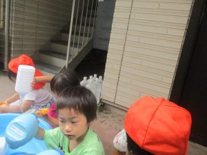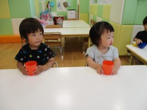 水遊びを行った子も、室内で過ごした子もこまめな水分補給を行っております。