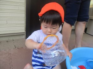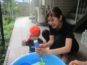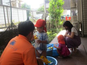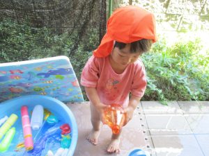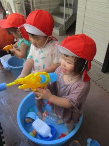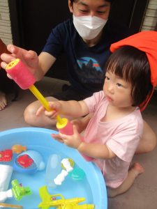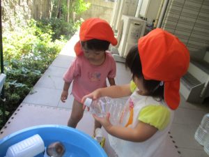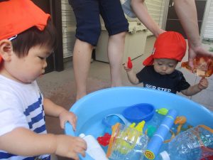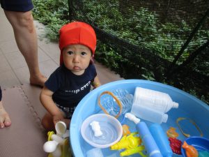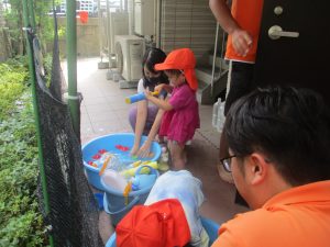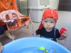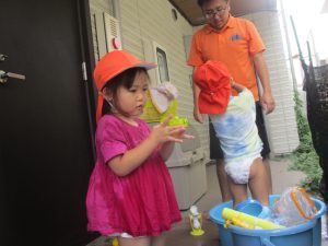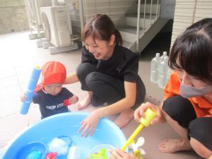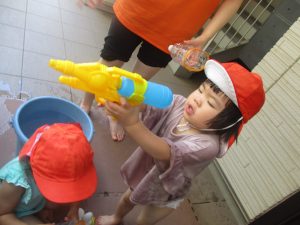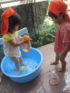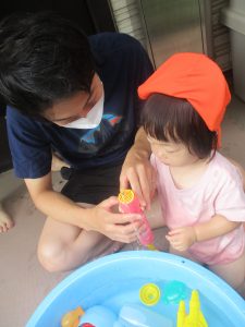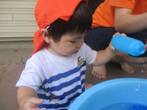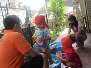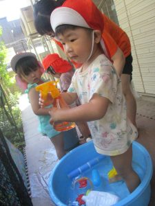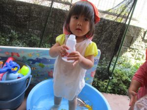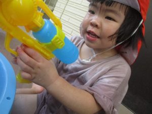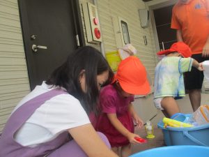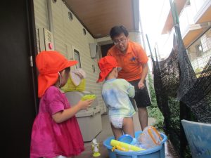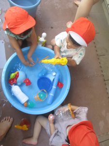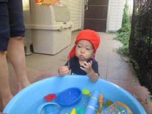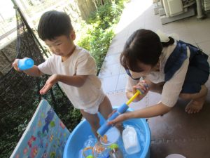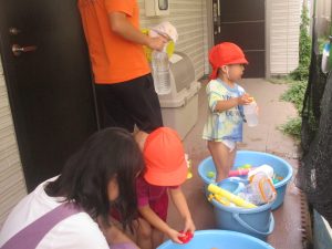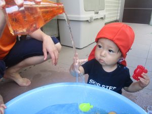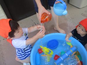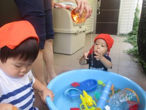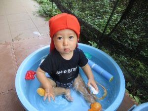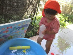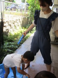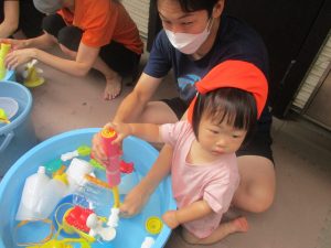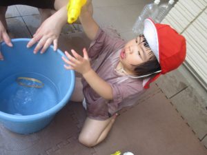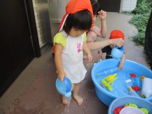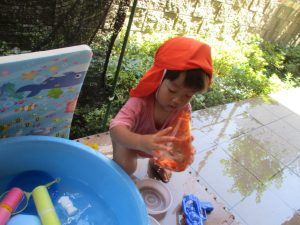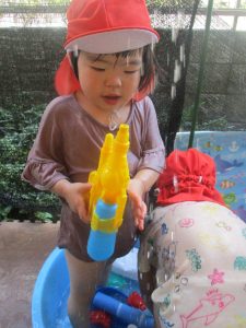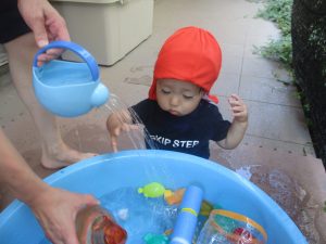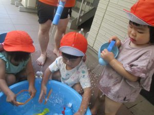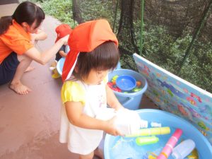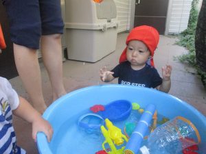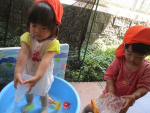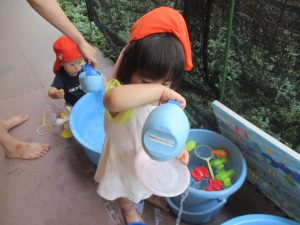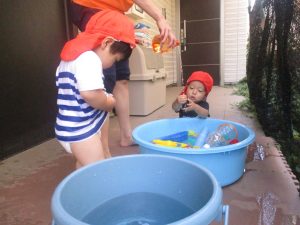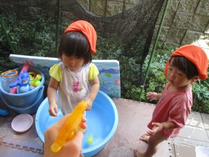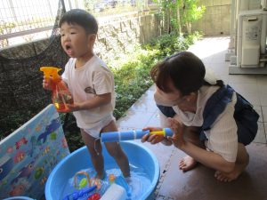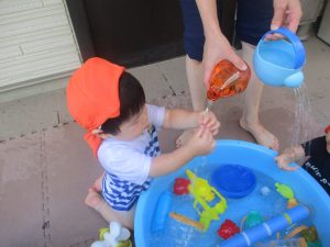 日中は水遊びを行ったり室内ではままごと遊びを楽しみました。