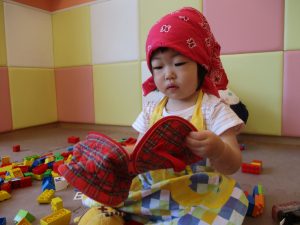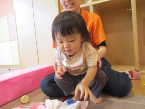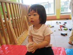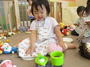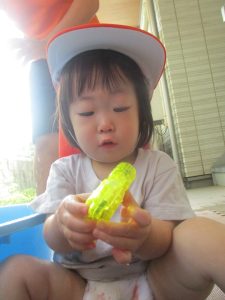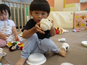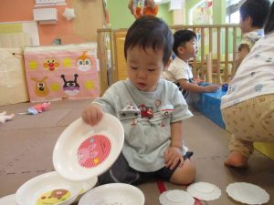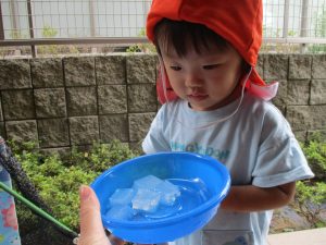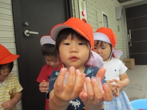 寒天を使用して感触遊びも行いましたが、独特な触り心地に不思議な表情を見せておりとても可愛いです!