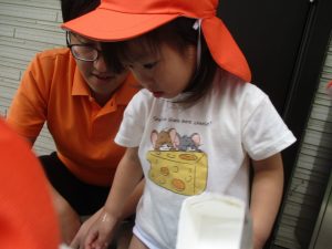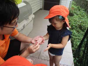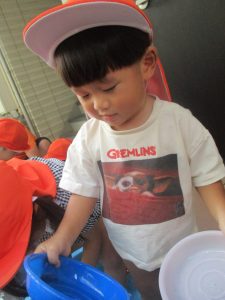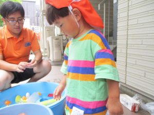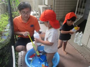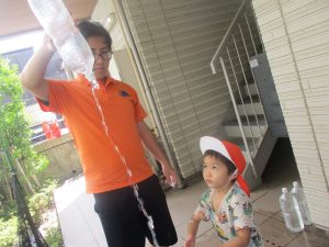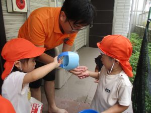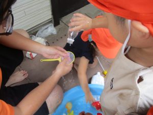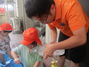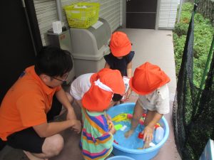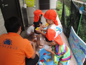 台風の影響でお天気の方が非常に不安定ですが、水遊び中は雨が降らず快晴の中行えました。