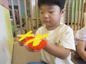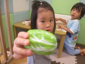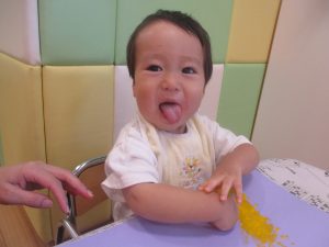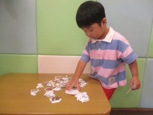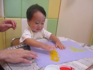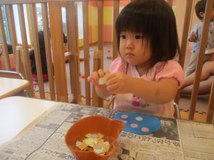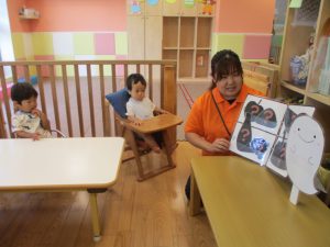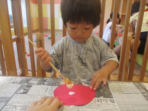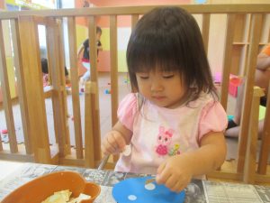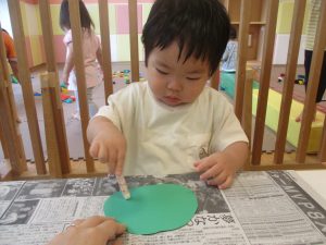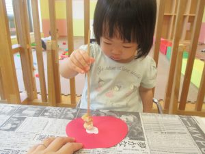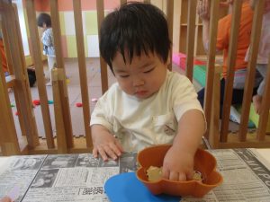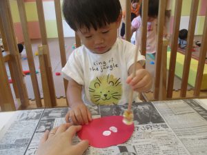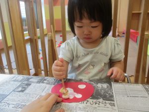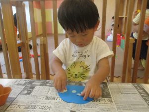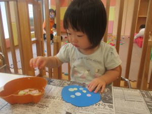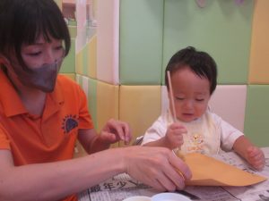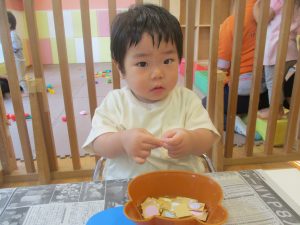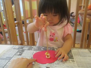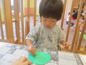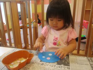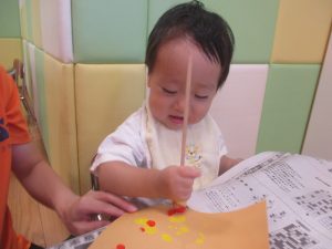 また、0.1歳児クラスのお友達は秋の製作を楽しみました。