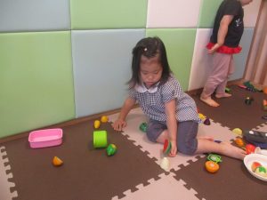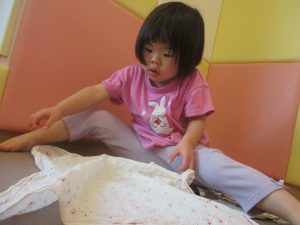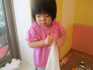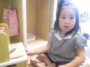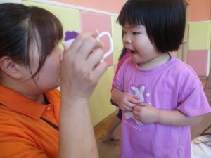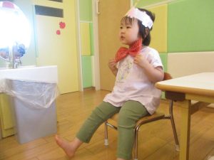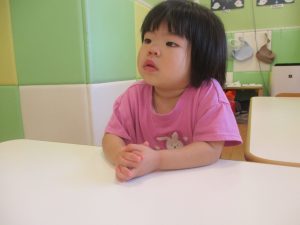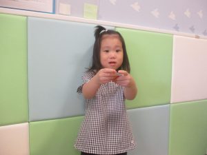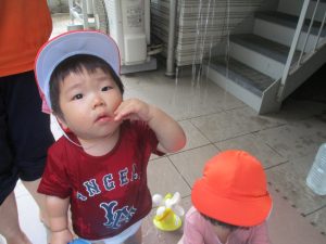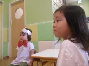 2歳児クラスの女の子、、、普段はニコニコなのですが、皆の前に出てとても緊張しておりました。笑