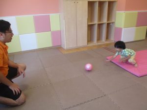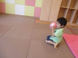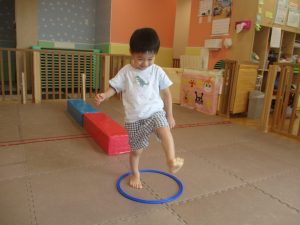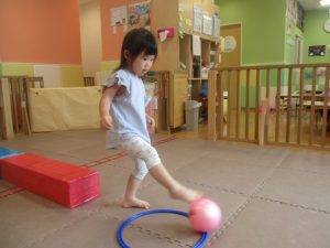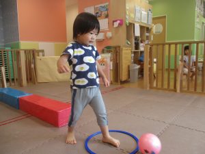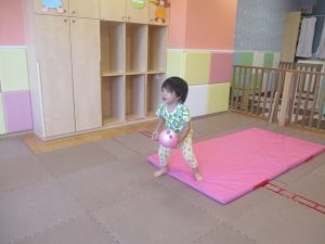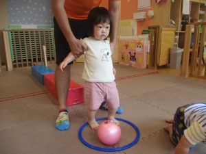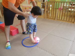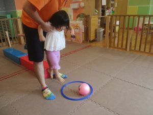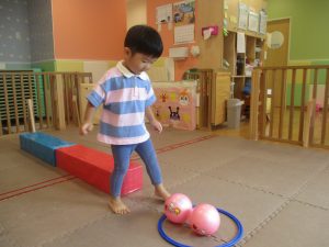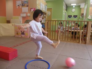 今月の体操では、脚でボールを扱う経験をしております。