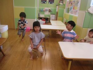 今月のリトミックでは少し雰囲気を変えて椅子に座ってスタート!