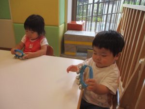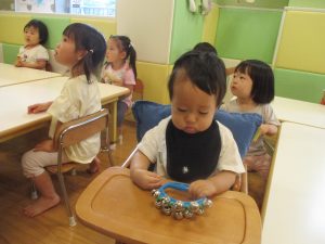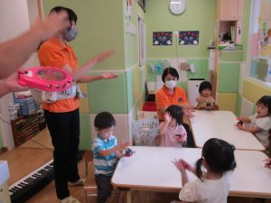 また、②鈴やタンバリン、カスタネットなどの楽器を使った音遊びも楽しんでみました☆
