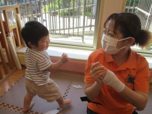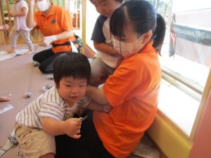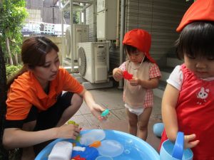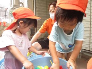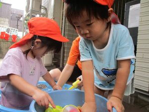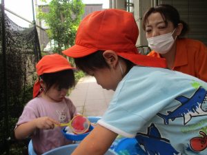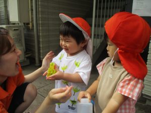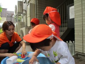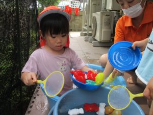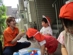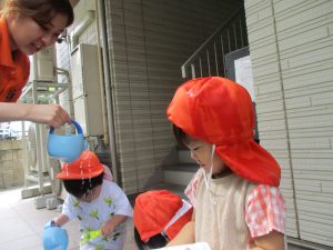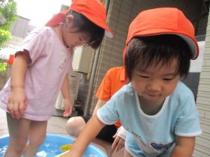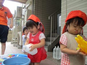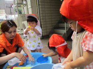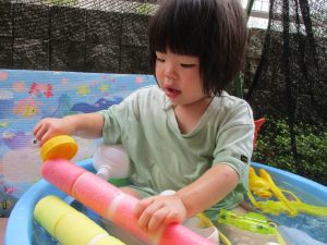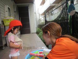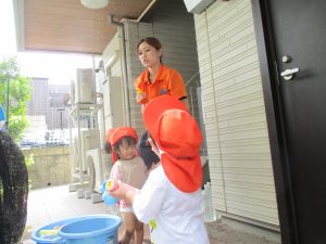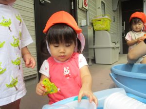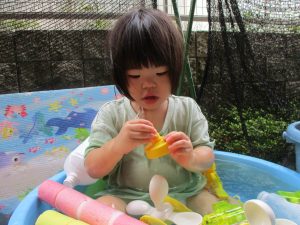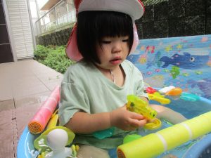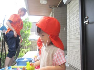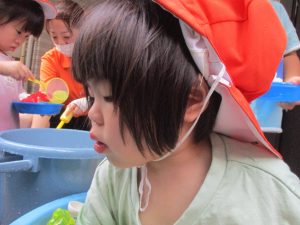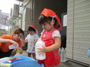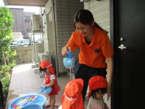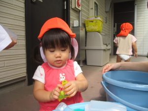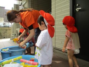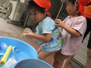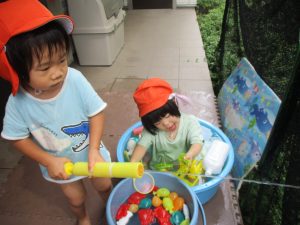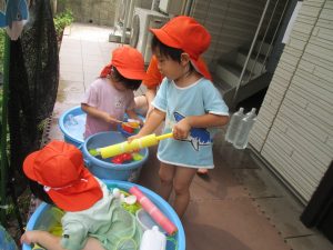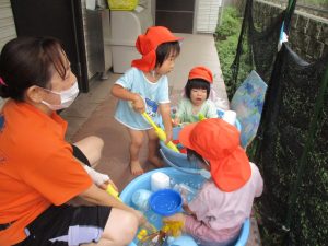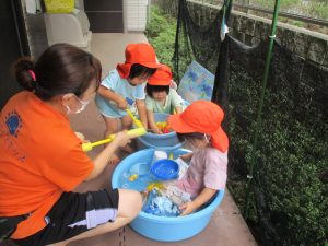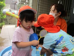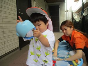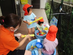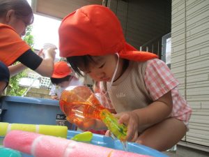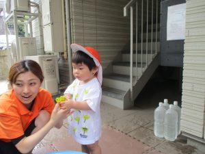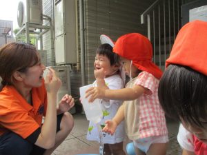 「最後の水遊びだよー!!!」との先生達の明るい声掛けに反応する如く、惜しむ思いで水遊びを行なえました。